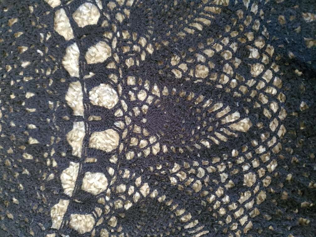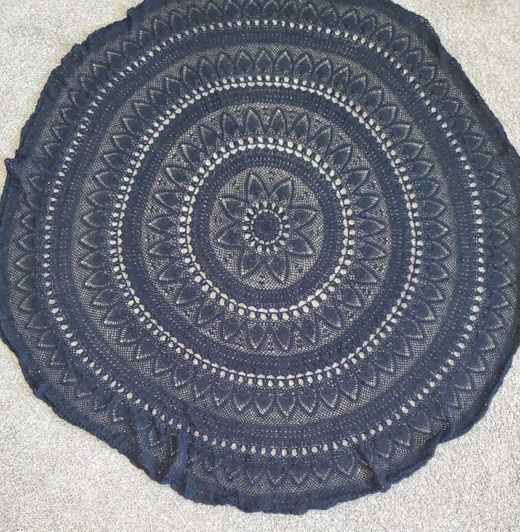Hand-crotched round tablecloth/doily. Measures 6 feet in diameter. Very intricate detail.