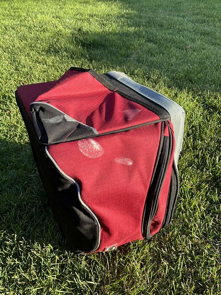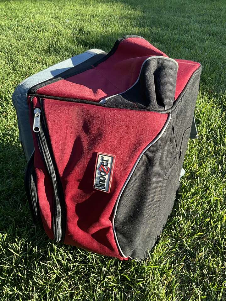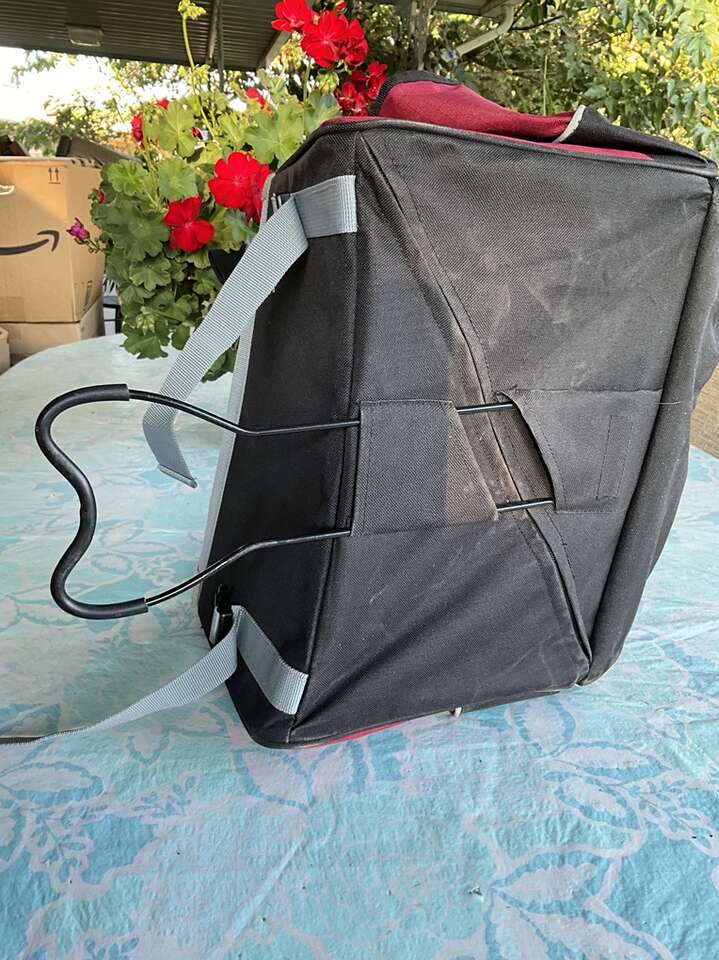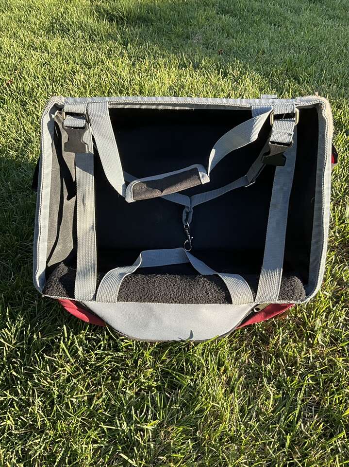 Small dog/pet open top carrier. Ha handles and a leash strap along with various pockets and a rain-coat cover, etc. Very good condition with the exception of some spots of paint on one corner; which doesn’t affect its use. Cash only.