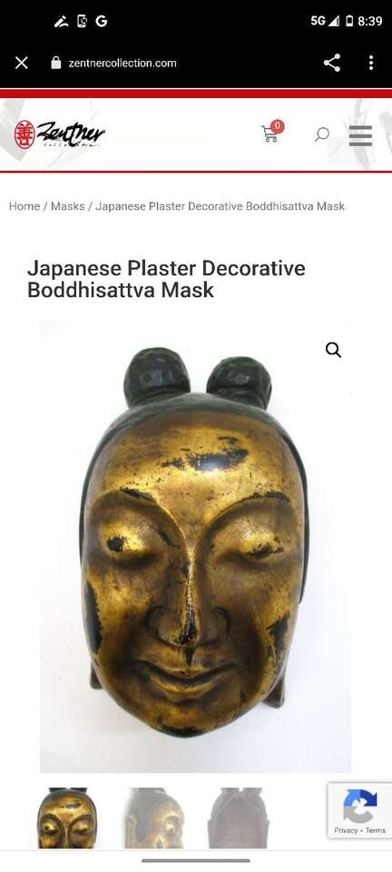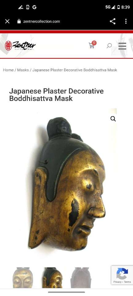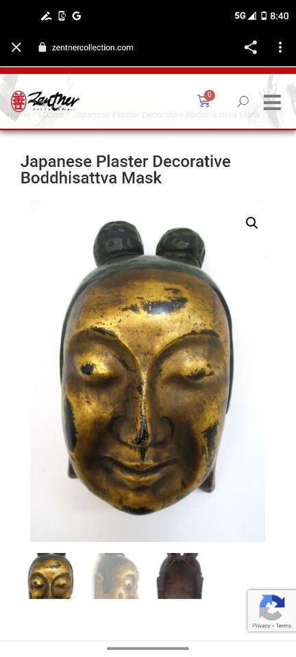 Japanese plaster and paper mache mask of a Boddhisattva (Bosatsu in Japanese), a Buddhist monk who has reached a high level of enlightenment. The mask has long earlobes, typical of a holy being in Buddhism, green lacquered hair pulled into two buns, and golden lacquer skin with traces of black lacquer. Early 20th century. Size: 8.5" height, 5" width