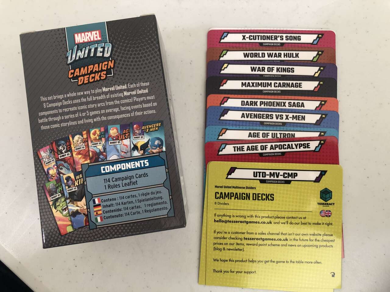This brings a whole new way to play Marvel United, in the form of Campaigns! Each of these uses the full breadth of existing Marvel United components to recreate iconic story arcs from the comics! Players must battle through a series of 4 or 5 Games on average, facing events based on those comic storylines and living with the consequences of their actions. The Kickstarter Exclusive Campaign Deck set contains 8 different Campaigns, for a total of 114 cards: The Age of Apocalypse – 7 Games (23 cards) War of Kings – 4 Games (16 cards) Dark Phoenix Saga – 6 Games (16 cards) Avengers vs. X-Men – 5 Games (17 cards) X-Cutioner’s Song – 4 Games (13 cards) Age of Ultron – 4 Games (8 cards) Maximum Carnage – 3 Games (8 cards) World War Hulk - 4 Games (13 cards) Also included are thick card stock, double sided, gloss laminated campaign dividers.