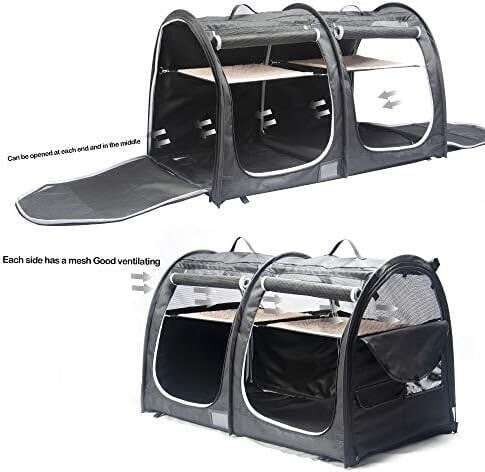 RELIABLE MATERIAL - The fabric outside cage is made of thick Oxford cloth to prevent pets from scratching and tearing, and it is durable. the frame is made of strong glass rod, which will not deform after repeated use. In addition, there are two front and rear doors with zippers, and the inner floor is made of high-strength mesh, which ensures air permeability. The outer layer is a curtain of Oxford cloth, both of which can be rolled up or pasted through the burr on the bottom and the cage.