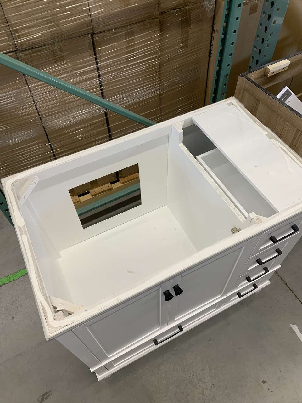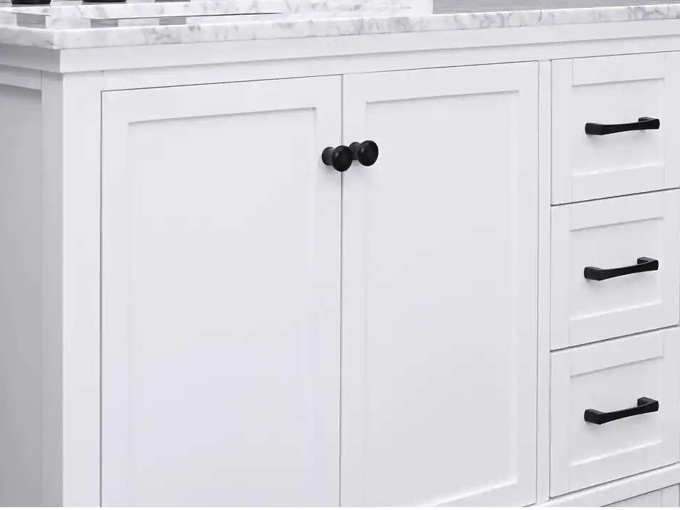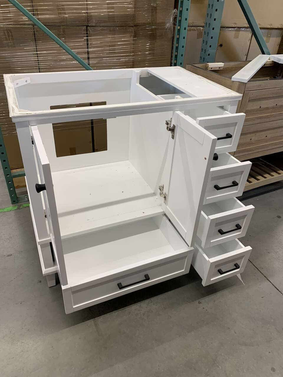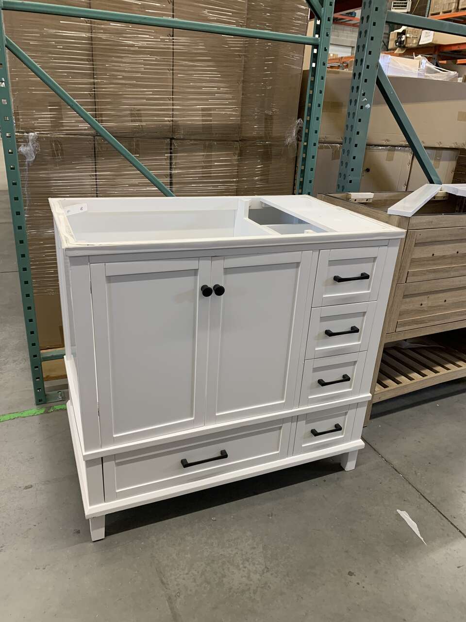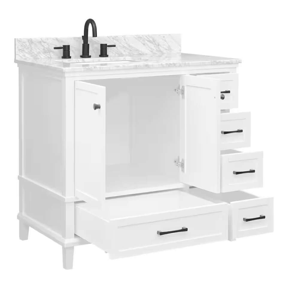 MSRP: $1,199 HOME DECORATORS COLLECTION MISSING MARBLE TOP & BASINOverall dimensions are 37 in. W x 22 in. D x 35 in. H White finish Constructed with durable poplar wood and MDF Includes matte black hardware 5 soft close drawers and 2 soft close doors Sink off set on the left side Adjustable height levelers Faucet not included