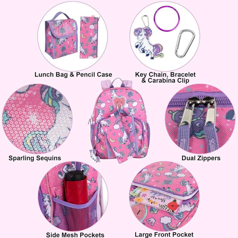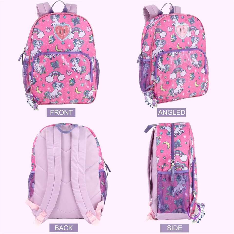 PINK UNICORNS RAINBOW BACKPACK FOR SCHOOL: Somewhere over the rainbow lives this enchanting unicorns rainbows & butterflies backpack that features a large main compartment that can easily fit notebooks folders pens pencils & more. Front zippered accessory pocket is perfect for snacks headphones & phones. Rainbow unicorn backpack for girls also comes with two mesh side pockets & padded adjustable straps