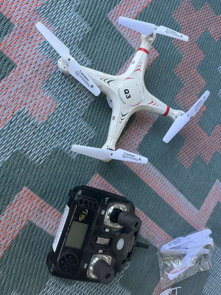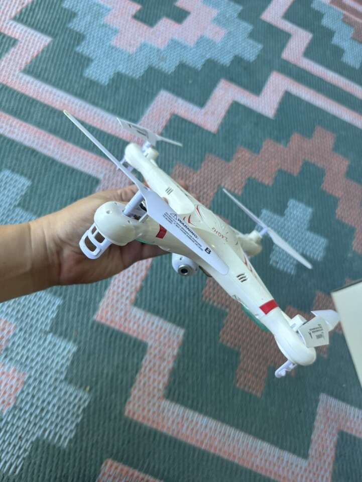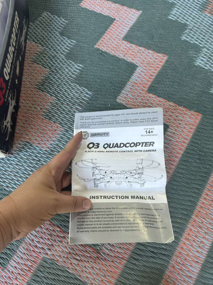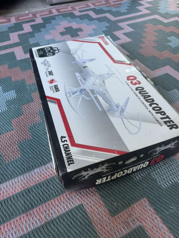 Details below. • CAMERA TAKES VIDEO AND STILL PICTURES • 4GB MEMORY CARD INCLUDED • 4.5 CHAMMEL REMOTE CONTROL QUADCOPTER • OMNIDIRECTIONAL MODE • 2.4GHz ALLOWS CONTROL RANGE UP TO 50 METERS • FLYING TIME 7-9 MINUTES • FLY INDOORS OR OUTDOORS • SIZE: 39cm X 39cm X 7 cm • INCLUDES PROP GUARDS FOR SAFETY AND PROPELLER PROTECTION