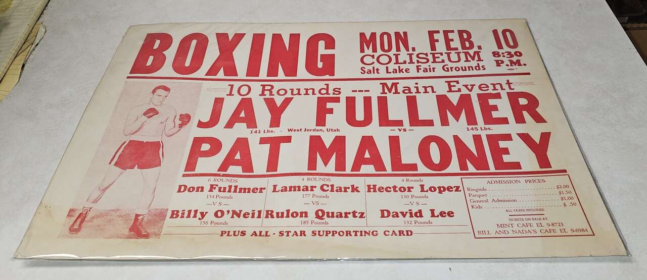 VenmoOffering this rare original Utah boxing poster featuring 2 of the 3 Fullmer Brothers with Jay as the main event. This took place in the Coliseum at the State Fairgrounds on Feb. 10th, 1958. The result of the main event was a 3rd round TKO by Fullmer after knocking Maloney down for a third time. Jay and Don were the younger brothers of Middleweight Champion Gene. Jay was forced to retire at 23 from an eye injury after 125 fights and turned to coaching. Tickets were purchased at Bill & Nada's or The Mint. Poster is thick carboard and measures 22" wide x 14" high. It's in nice condition and displays well. There is some yellowing on the edges that is not as prominent as the pictures show. Currently in a plastic cover. Located in Sandy. Call or text Doug 801-403-0543