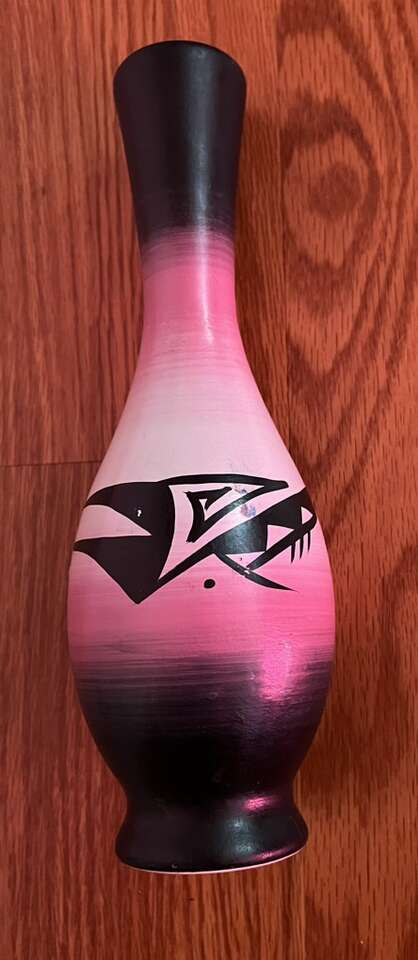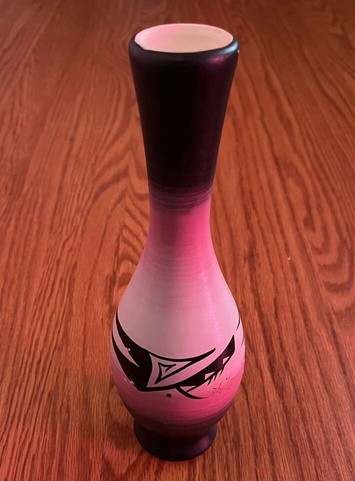 Signed white-purple-black hand painted Native American ceramic vase/ souvenir. Never used, was displayed in smoke and pet free home. It is 9,5” tall x 1,5”-2” in diameter. $15.