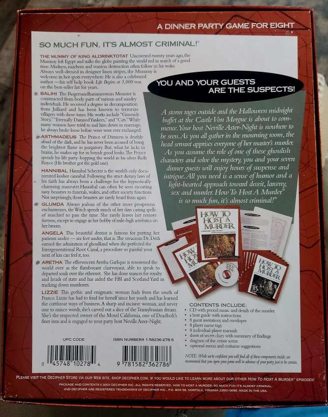 A storm rages outside and the Halloween midnight buffet at the Castle Von Morgue is about to commence. Your host Neville Aster-Night is nowhere to be seen. As you all gather in the mourning room, the head servant apprises everyone of her master's murder. As you assume the role of one of these ghoulish characters and solve the mystery, you and your seven dinner guests will enjoy hours of suspense and intrigue. All you need is a sense of humor and a light-hearted approach toward deceit, larceny and murder.