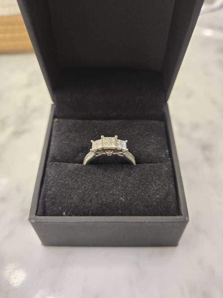 I am selling a 3 stone diamond engagement ring. White gold band. Size 9. Total ct wt .9500. Multi diamond center. Class 199. Forever Cherished Collection. Only worn for a few months. All 6 month inspections and cleaning to keep up on warranty from Kay Jewlers completed. Lifetime warranty transferable. Only reason I am selling is because we bought a different ring. I have all the paper work including the receipt and original box. Stated Value $2000 and retail $2000. I paid $1850. Asking $1000. Make me a resonable offer. Call or text. No scams. 801-864-5180