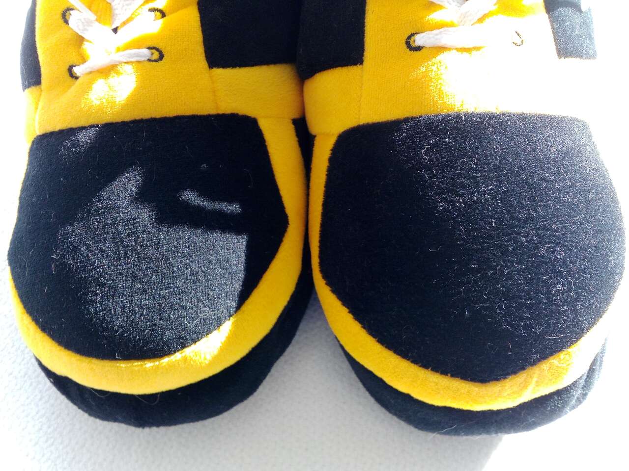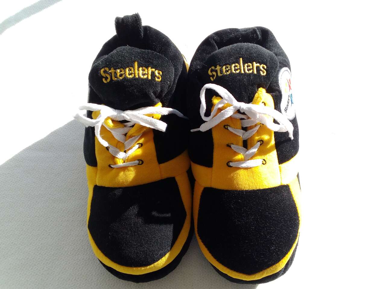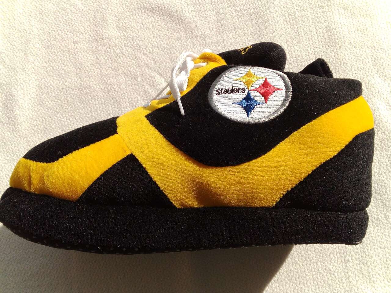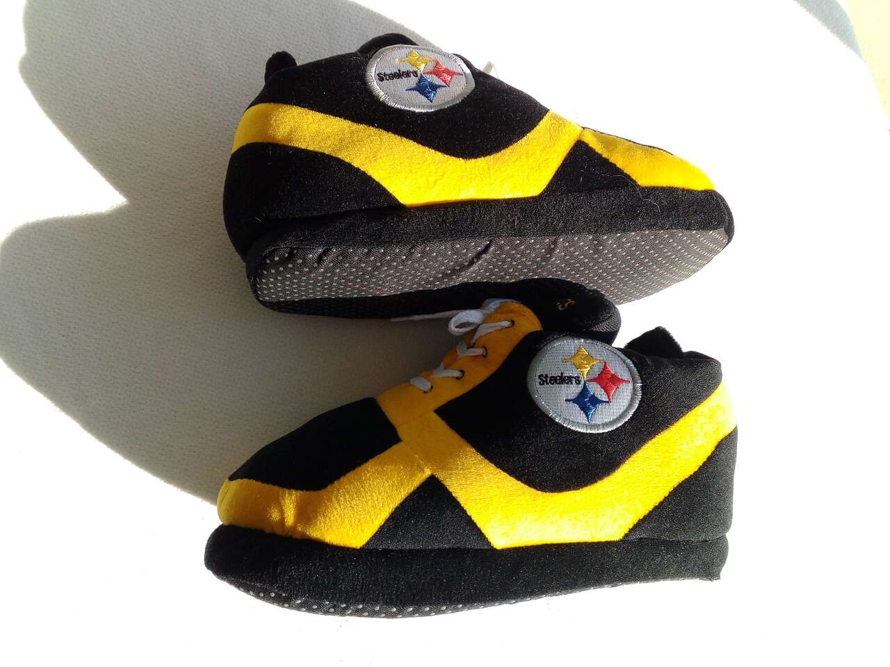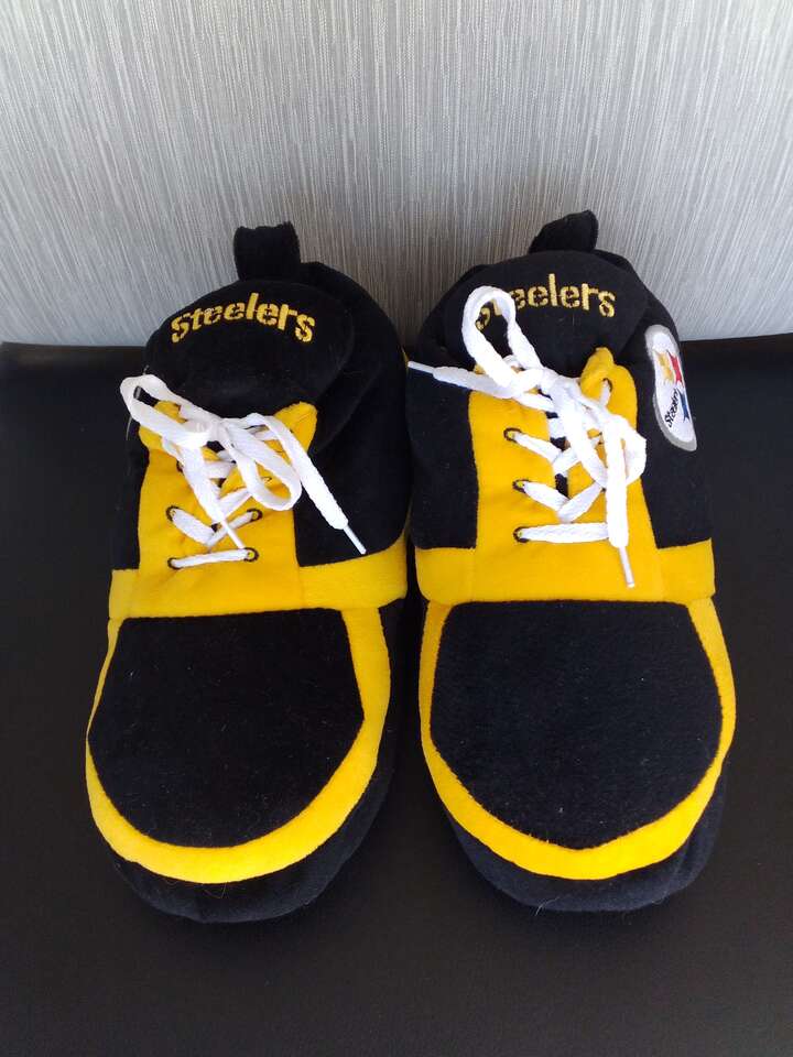 Steelers slip-on football slippers! These never been worn non-slip slippers are perfect for any fan of the National Football League (NFL) and the Pittsburgh Steelers. The black and yellow color combination is a must-have for any fan of the team. These slippers are sized for men 9.5 and feature a lace-up design that ensures a comfortable and secure fit. They're made from high-quality materials and are perfect for wearing during the game at home or just around the house. Show off your love for the Pittsburgh Steelers with these stylish and functional slippers!