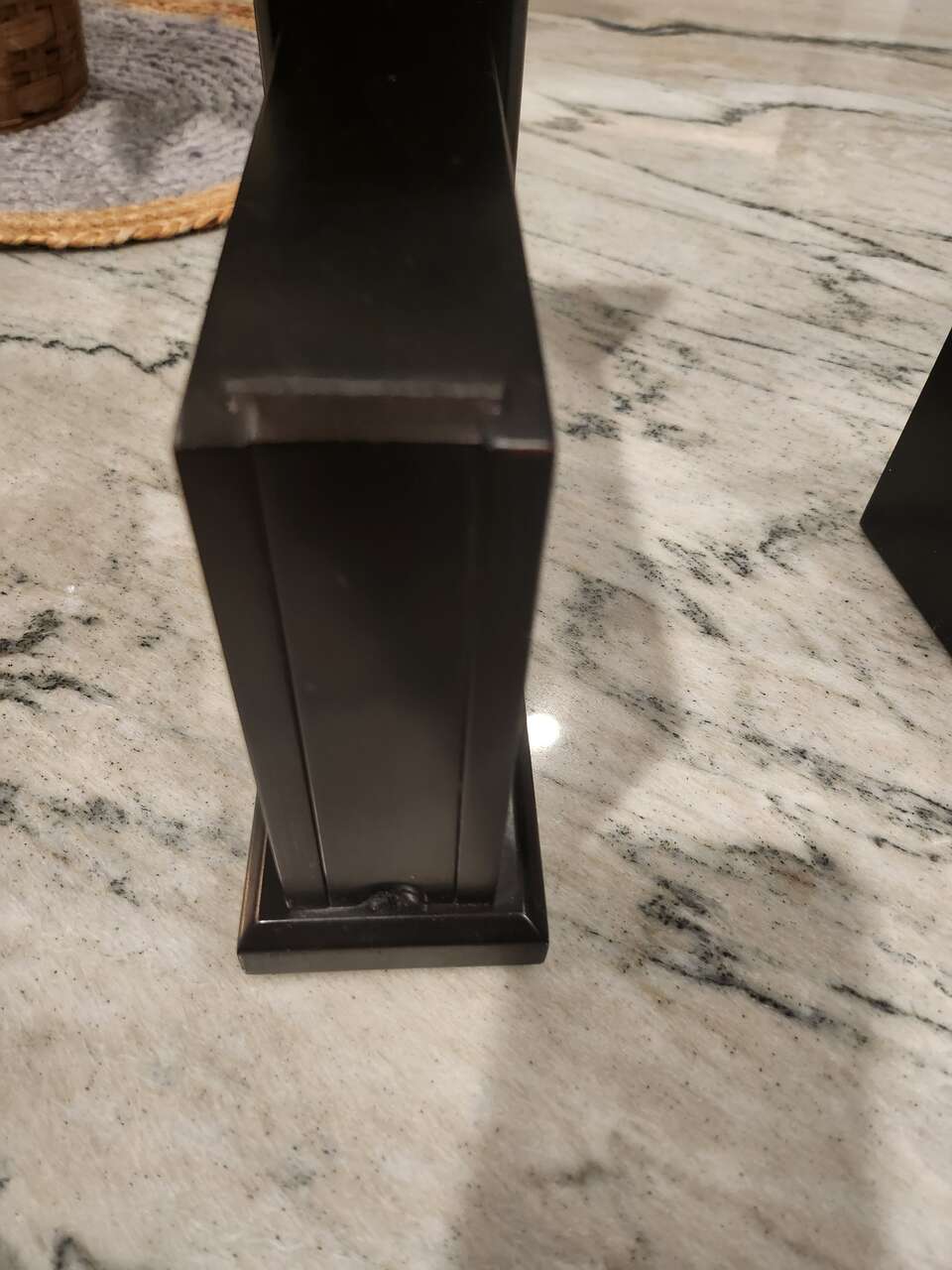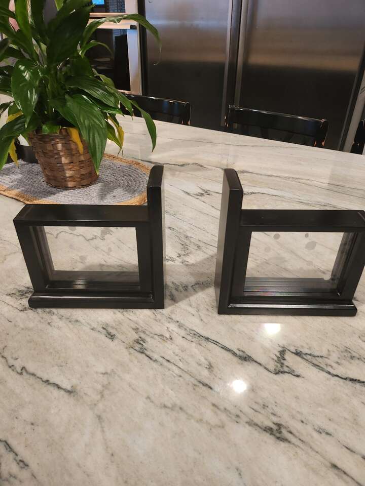 VenmoWood bookends, black, with photos. Each has three photos slides for displaying either a single photo or layering photos for a 3D affect. Easy to add or change photos. Sturdy. Able to hold heavy or large books in place. MEASUREMENTS: Eight (8) inches in length. Eight (8) inches at highest point, near books and six (6) inch photo frames. Three (3) inches deep.