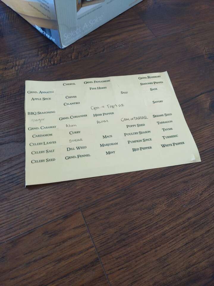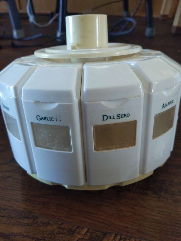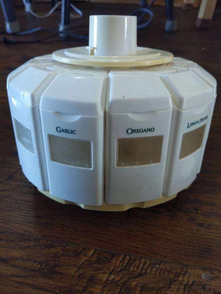 VenmoThis spice rack is used but still in good condition. The spices I used in it are allspice, red pepper, basil, alum cream of tartar, garlic, oregano, lemon pepper, ginger, paprika, garlic powder, and dill seed. It can hang under the cabinet or be used on the counter and has a handle that can be put on top to move it. It got a cursory cleaning but they still smell like the spices I had in them. A more thorough cleaning would be needed. Some of the spices have left discoloration inside. I left the labels on but they can easily be removed if desired. This holds 12 spices and you can spin them around to get to the spice you need. There's also a storage attachment on the bottom for a measuring spoon that I don't have anymore but it can be taken off. Smoke free home. I am selling another one and they can be stacked together. Also, I do have a few extra stickers that I didn't use.