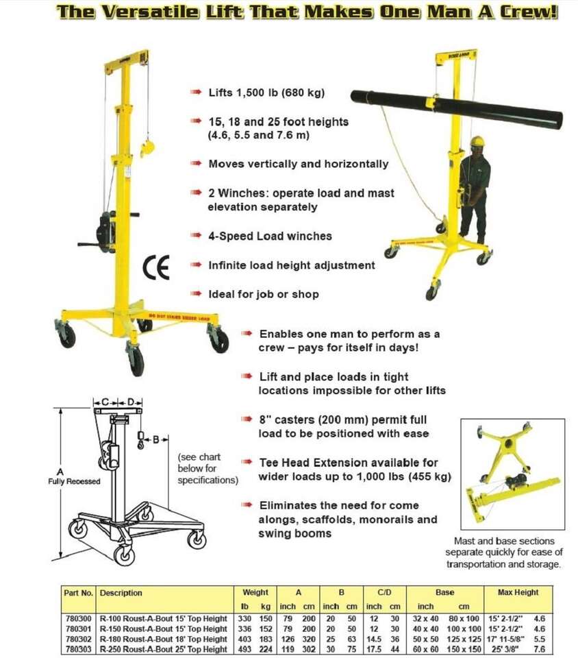 VenmoUnlock your project’s potential! We provide top-quality specialized rental equipment tailored for the plumbing, electrical, and skilled labor trades to support advanced DIY projects. We have the tools you need to get the job done right. Got a better price? We’ll match it and beat it! Just bring us your approved quote and save even more on your rental. Weekly and Monthly Rental rates also available - inquire for pricing The Sumner Roust-A-Bout enables one man to lift and place loads in tight locations that would be impossible with other lifts. The flexible Roust-A-Bout not only makes the job possible. It can pay for itself in days by reducing job time! This dependable lift can raise a 1,500 lb. (680 kg) load to heights up to 25 feet (7.6 m) in minutes. In addition, large 8" (200 mm) casters permit a fully loaded Roust-A-Bout to position pipe or beams with ease. Wider loads up to 1,000 lbs (455 kg) can be handled with the addition of Sumner's Tee Head Extension Bar. The Roust-A-Bout eliminates the need for many other tools such as come along, scaffolds, monorails, and swing booms. Lifts 1,500 lb (680 Kg) Moves vertically and horizontally Two winch system operates load and mast elevation separately Lift and place loads in tight locations Mast and base separate quickly for easy transport