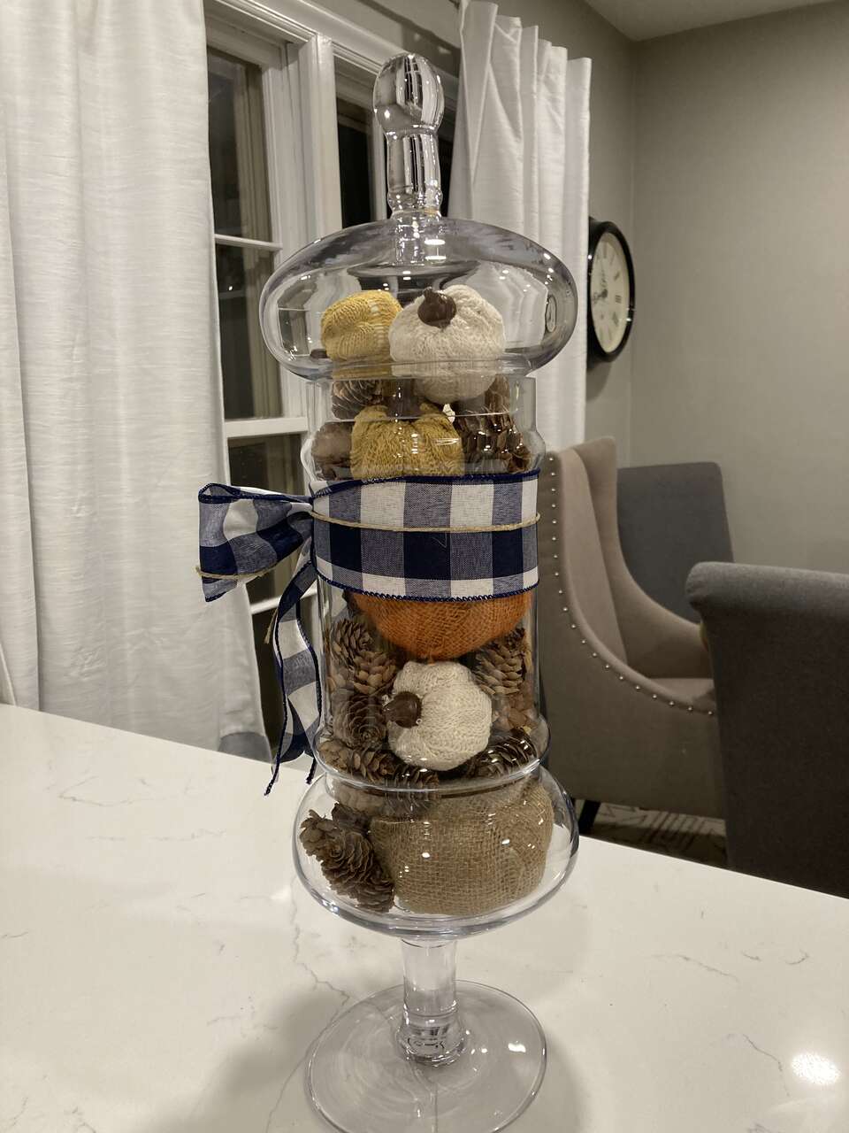 VenmoThis festive fall decor is PERFECT to spruce up any room in your home! The apothecary jar is 22.5 inches tall and is filled with sweater and burlap covered pumpkins with tiny pinecones peppered in between all tied together with a navy and white checkered ribbon. Free delivery if within a 30 mile radius of Salt Lake.