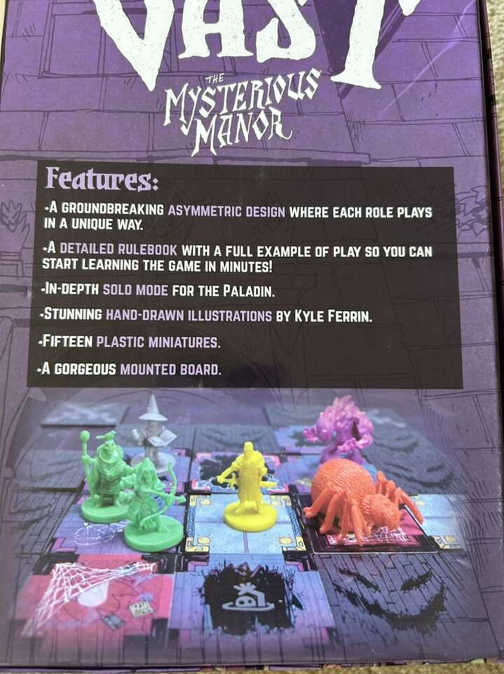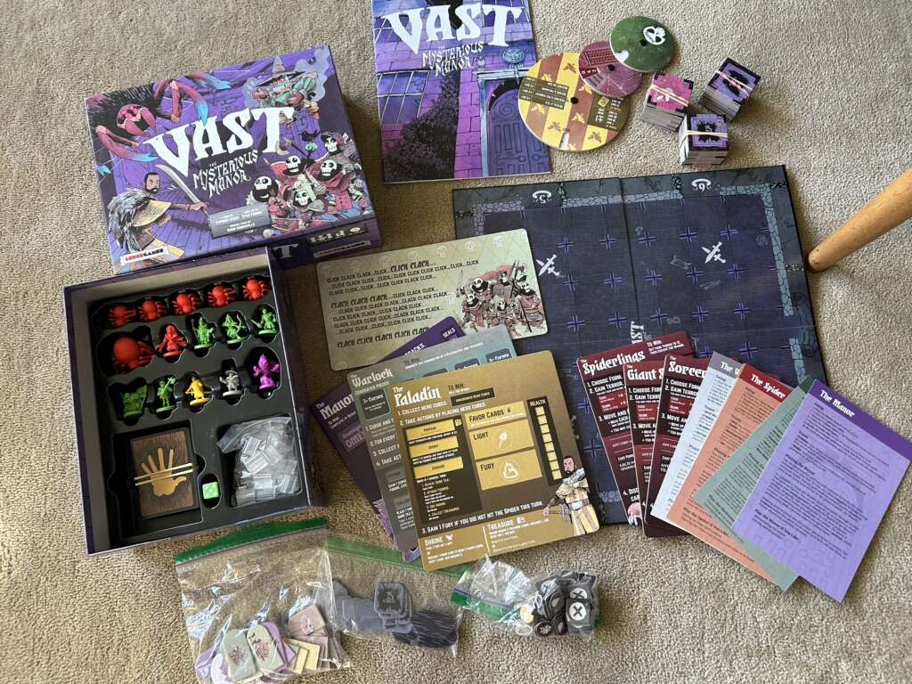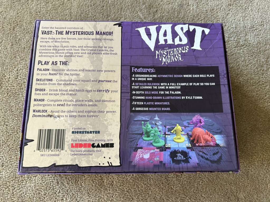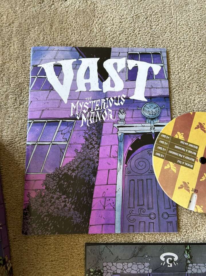 COMPLETE Vast: The Mysterious Manor Game. 1-5 players, ages 10+. Leder Games, first edition, first printing, 2019. Funded on Kickstarter. High-quality game. Complete, no missing pieces. Excellent condition. One small dent in bottom of box. Text only. Cash or Venmo.