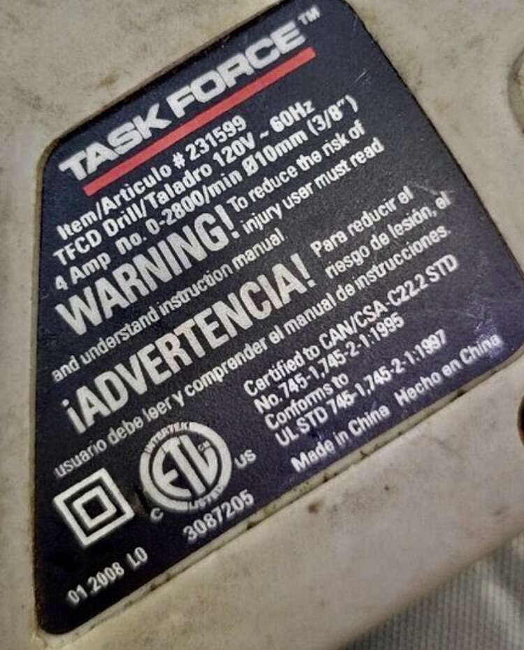 VenmoTask Force brand Electric 3/8 Inch Drill, Corded with quick release chuck. Has some paint on one side -doesn’t effect use. Message me if you’re interested in buying it.