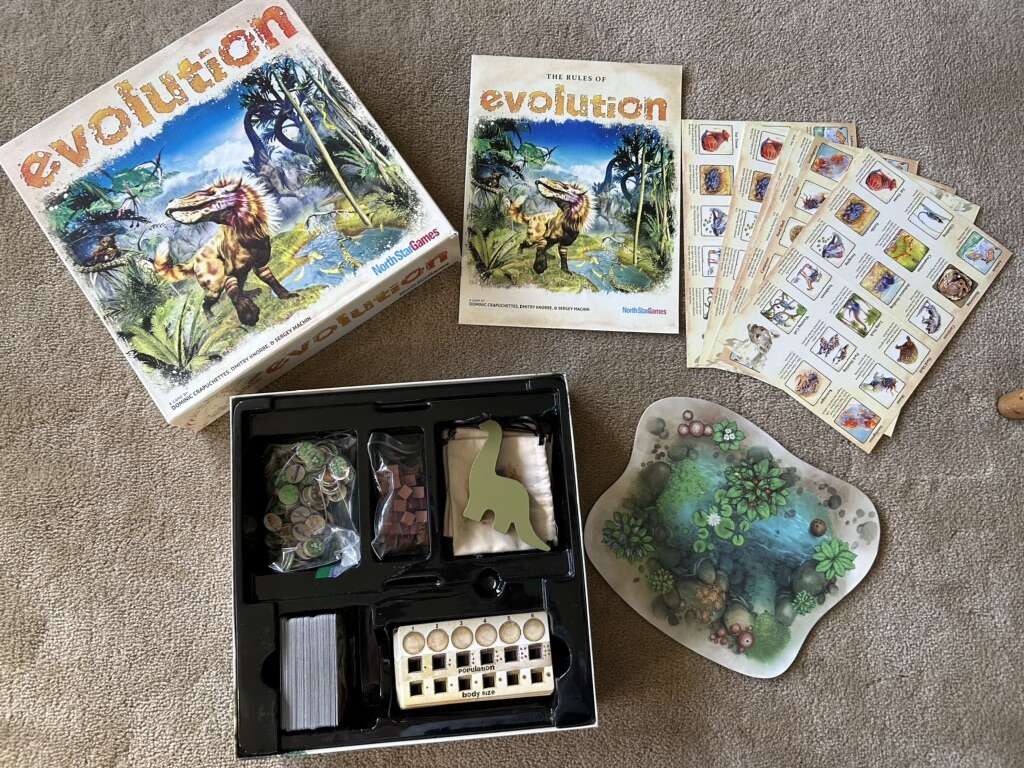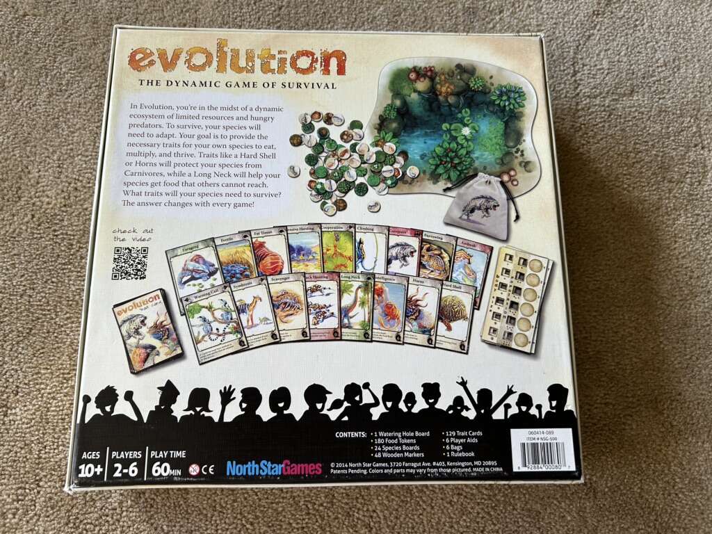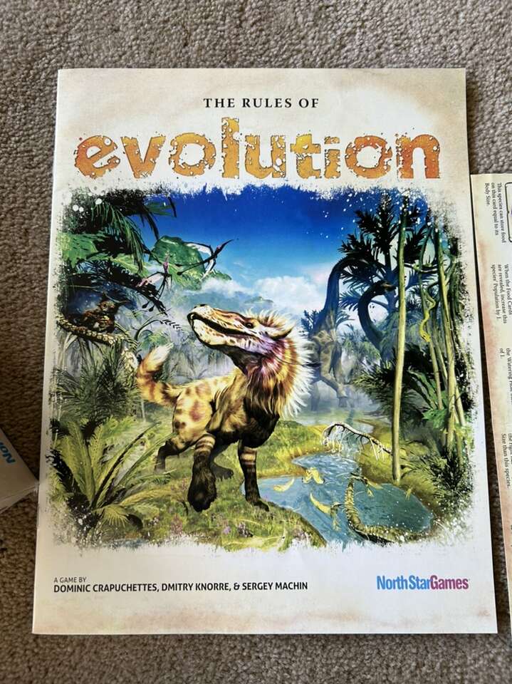 COMPLETE Evolution: The dynamic game of survival. Ages 10+, 2-6 players. North Star Games, 2014. Rare first edition. Complete, no missing pieces. Excellent condition. Some wear on box corners. Text only. Cash or Venmo. Discount on multiple items.