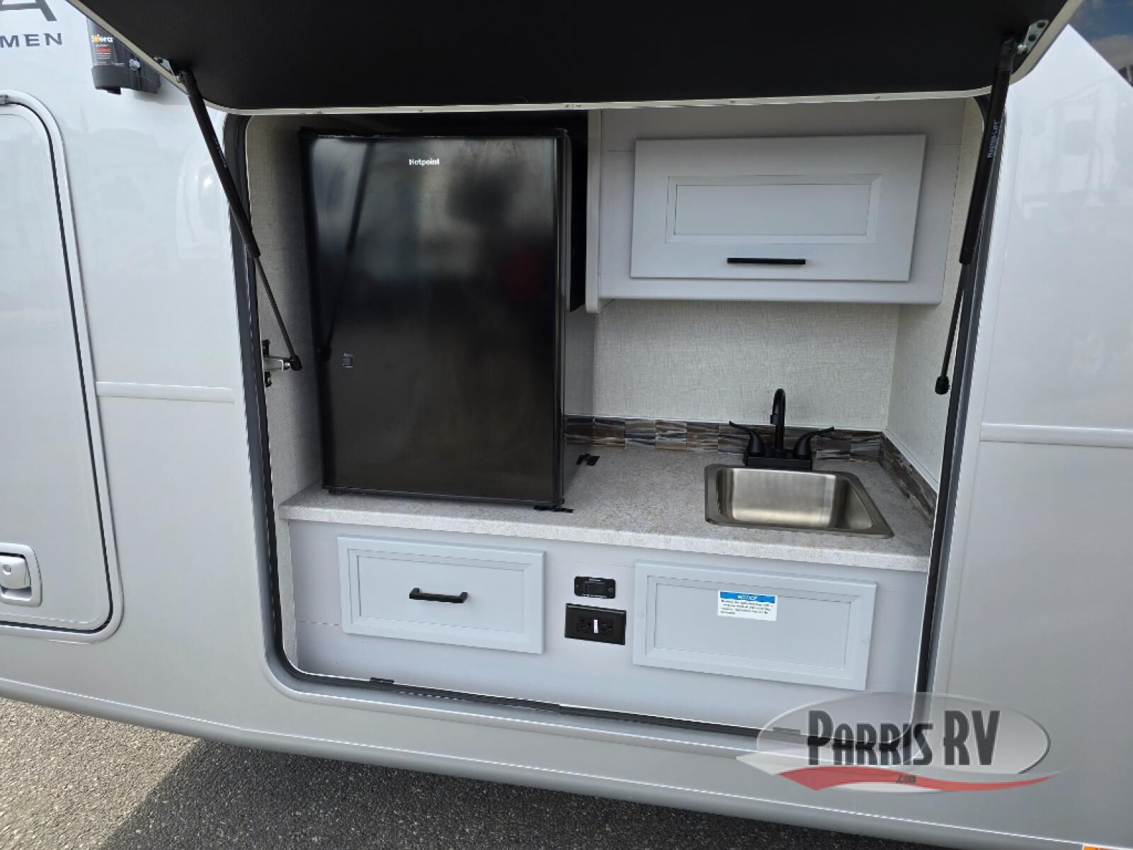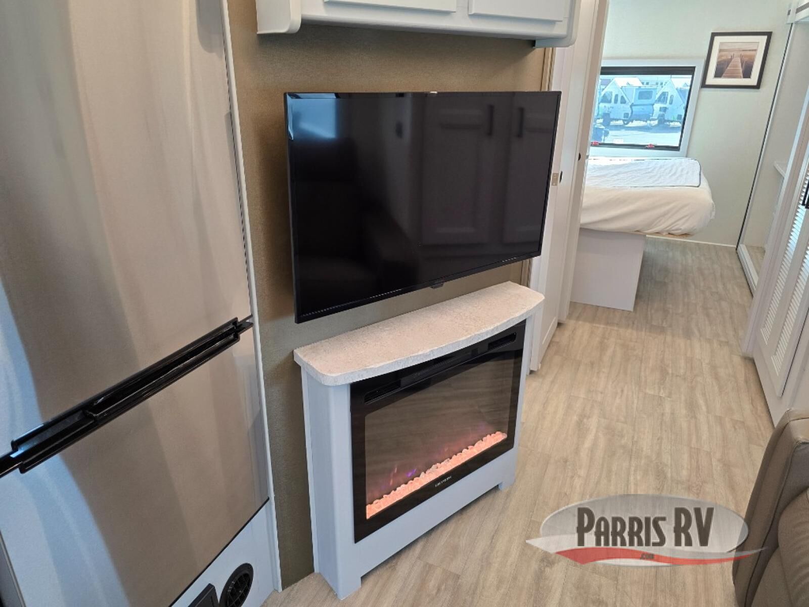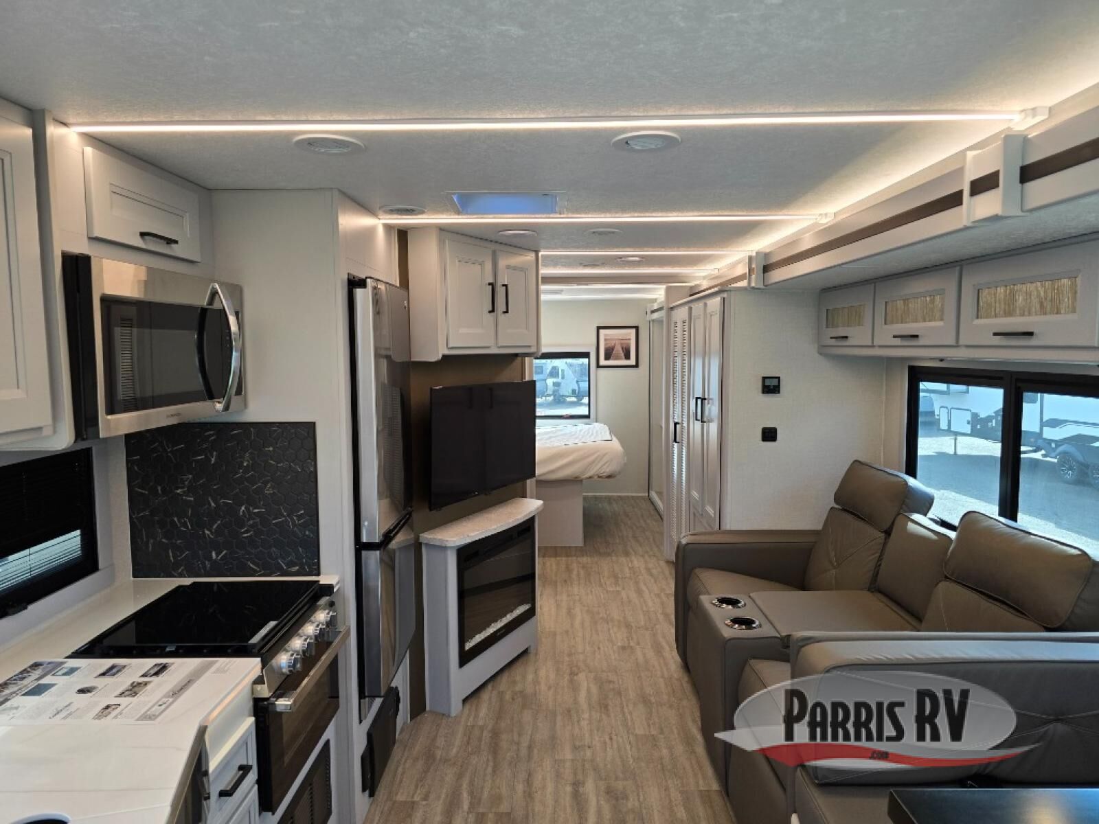 Experience a comfortable trip every time in this motorhome! It features a rear private bedroom with a 70" x 74" king bed including a storage system, a CPAP station above it, and opposite an LED TV above the dresser. Freshen up each morning in a full bathroom with a radius shower, and you can keep your clothes clean throughout your entire trip if you choose to add the optional stackable washer and dryer in the space opposite that has been prepped for it. The chef will have an easy time preparing their best meals indoors with a three burner cooktop, but can also enjoy cooking at the outside kitchen as well. The 42" x 76" booth dinette offers a comfortable place to enjoy your meals, and the 78" sofa with bed is conveniently across rom the LED TV and fireplace for a cozy evening indoors. Plus, you even have an exterior LED TV to watch the big game outdoors!