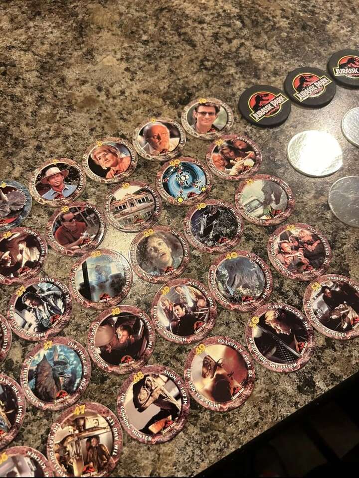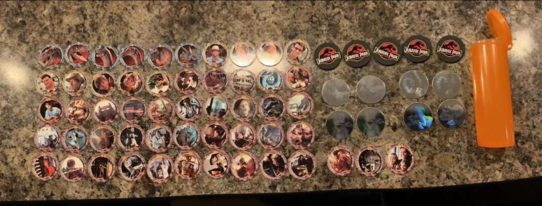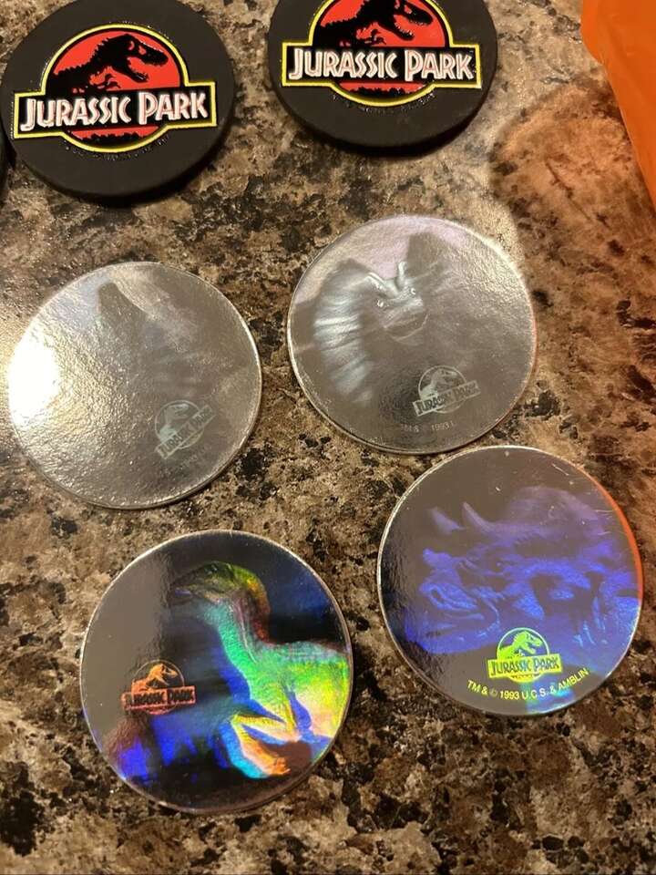 This Jurassic Park vintage Pog set is a complete collection of 54 colorful POGS, and in addition, includes 8 extremely rare holograms and 5 slammers originally from 1994. These have never been played with. Out of the view of light, moisture, etc. - from a smoke-free home. Hard to come by and extremely hard to find a set as complete as this. This set is in perfect condition.
