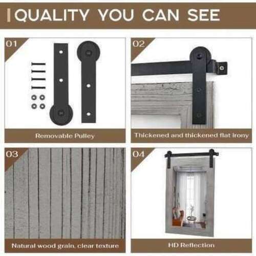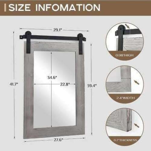 About this item VINTAGE DESIGN: This farmhouse mirror was inspired by the design of a barn door. It is a perfect combination of rustic and industrial styles that can add a warm farmhouse atmosphere to your home QUALITY MATERIALS: The frame of the barn door mirror consists of an antique solid wood frame and a sturdy metal bracket. The interior features a 4mm HD silver mirror with clear and distortion-free reflections, providing a better sense of light and projection in your space EASY TO INSTALL: The overall size of this rustic mirror is 41.7 x 29.1 x 0.67 inch, and the display size of the mirror is 34.6 x 22.8 inch. The track is 29.1 inch. You can first fix the iron bracket on the mirror, then install the track on the wall, and finally the wheels on the iron bracket will be stuck into the track to complete the hanging USAGE OCCASIONS: This wall mirror is perfect for hanging in a large bathroom. Hang over the sofa in the living room or over the fireplace as an addition to the themed space of the farmhouse. If you are planning to remodel your room, then it would be a good choice ACCESSORY INFORMATION: Mirror *1, Iron rails *1, Iron pulley *2, Mirror wipe 1, Expansion screw (845mm) *2, Black nuts/screws *4