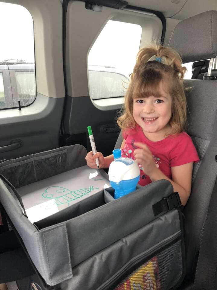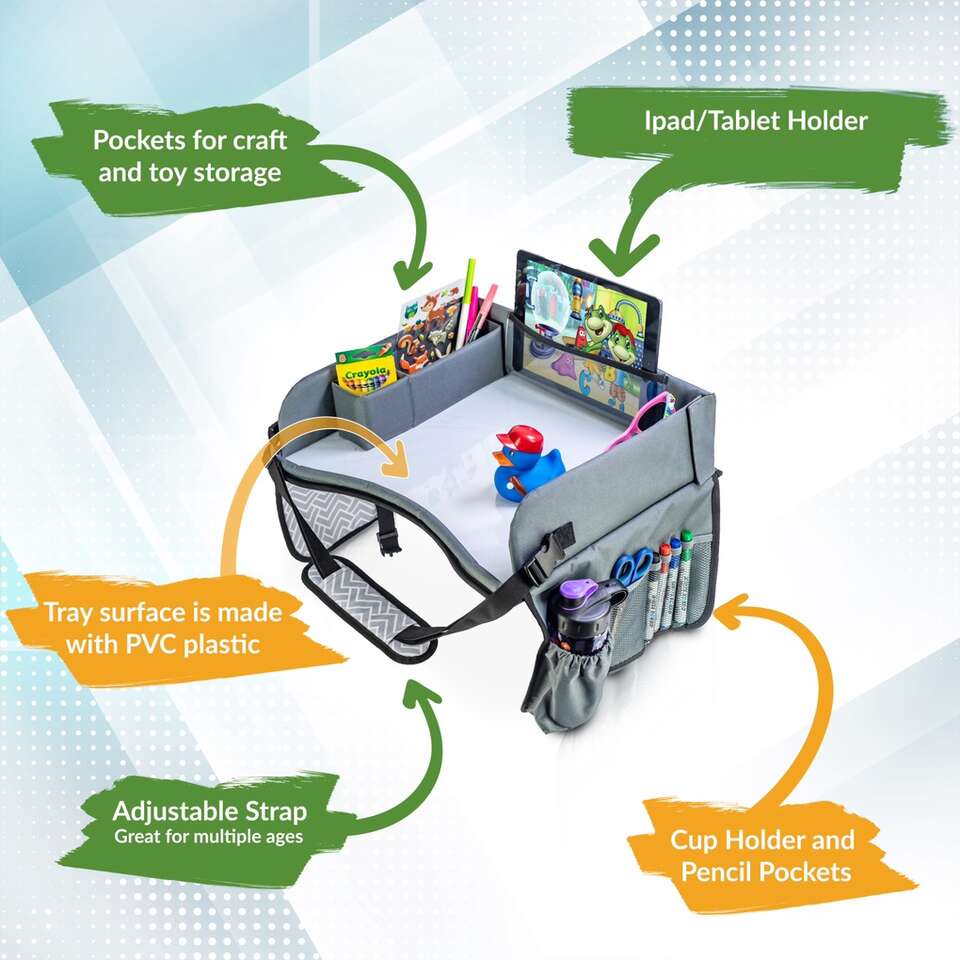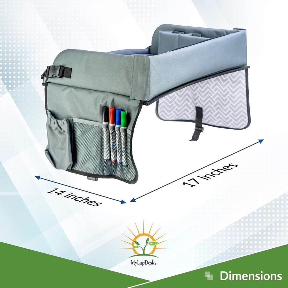 This tray is great for kids in the car, especially on long trips. I have several of these. Comes with dry erase markers.