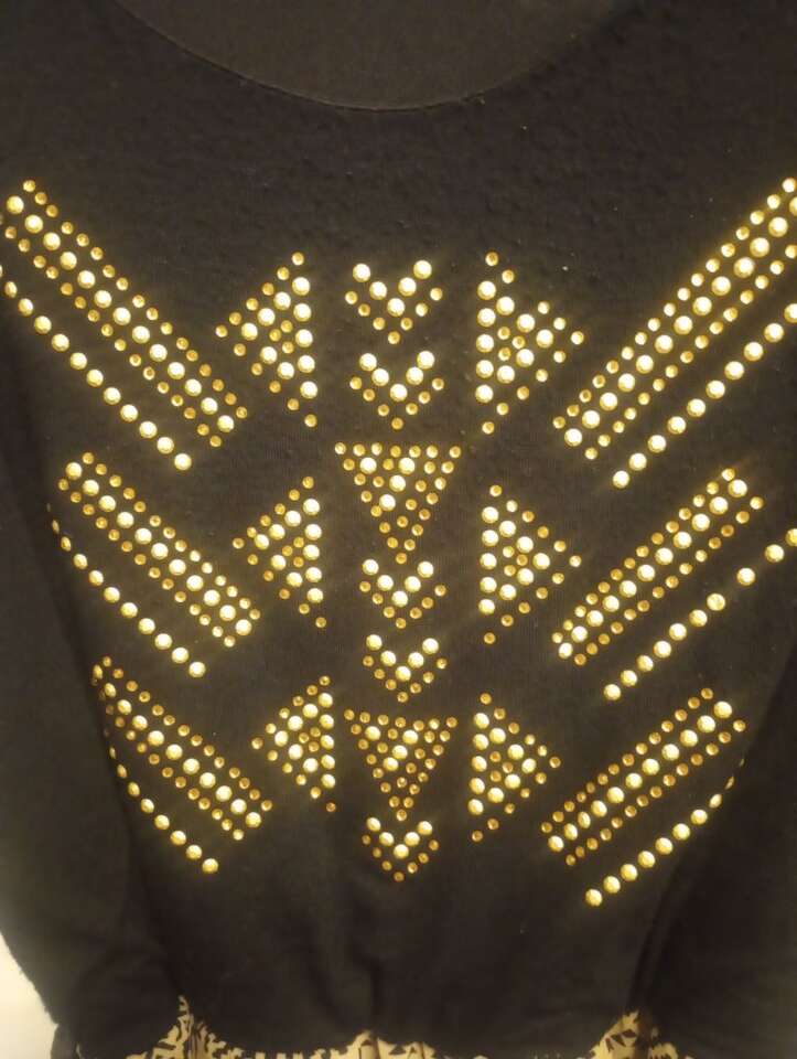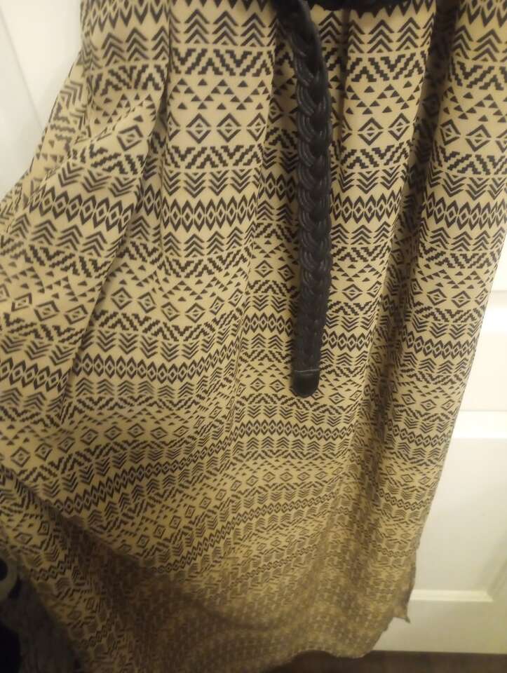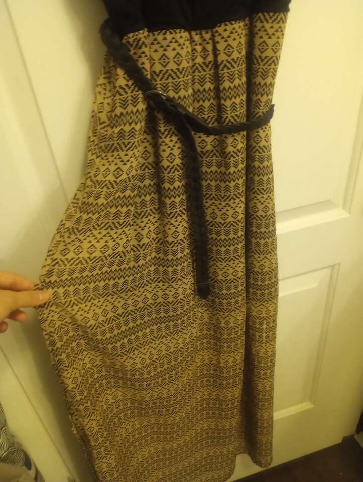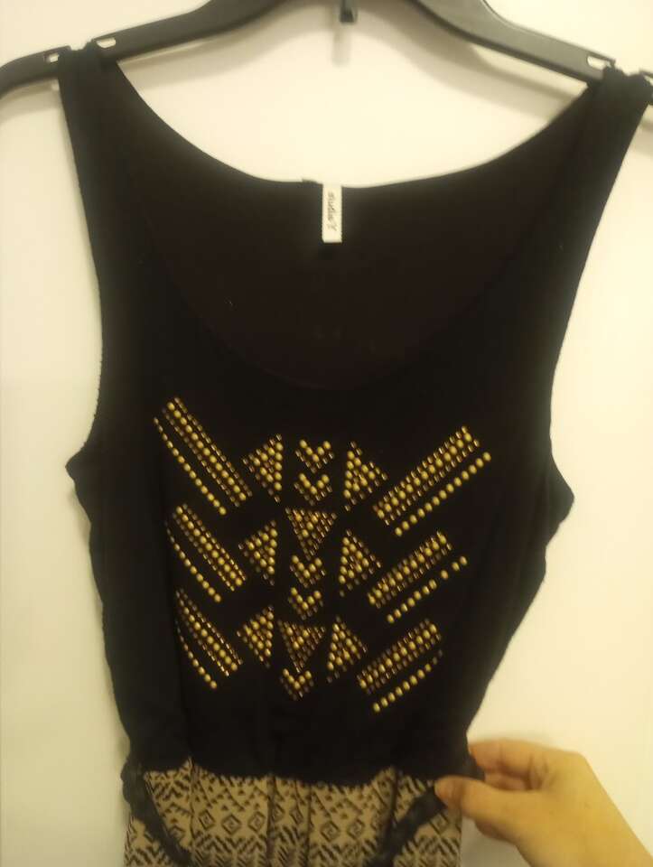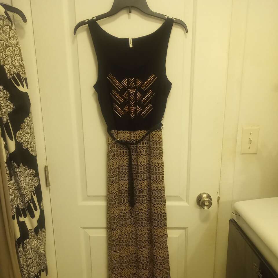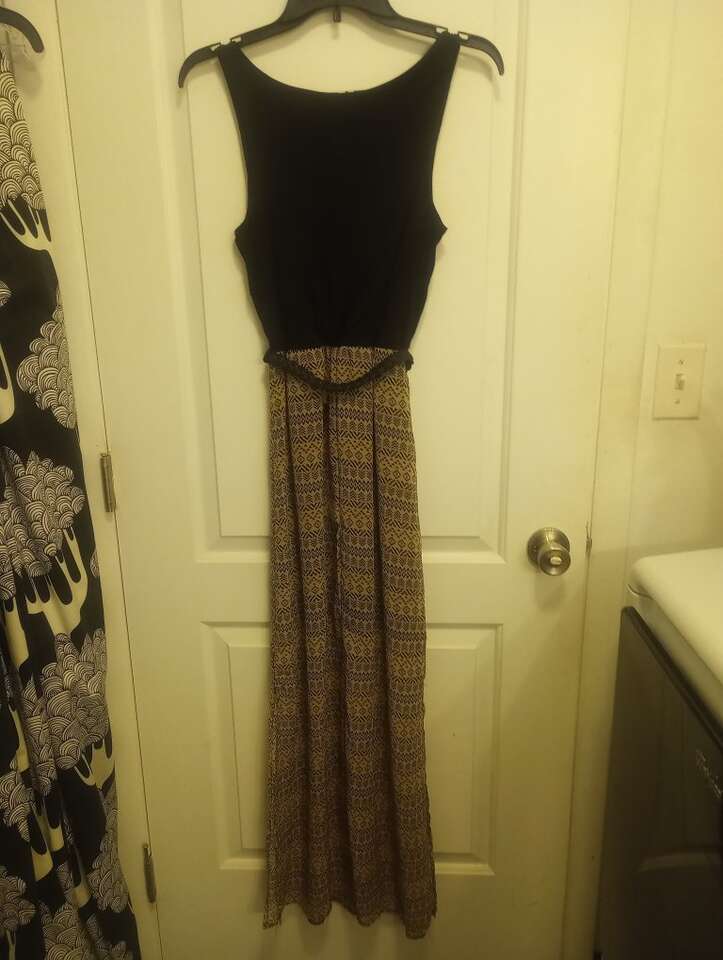 Used Sleeveless Maxi Dress~black & tank with gold rhinestones on chest. Comes with a black belt. Skit has slits on both sides. Top has a little pilling/signs of wear. Still looks really nice and has a lot of life left in it. Size XS. From a pet and smoke-free home. $8 cash or Venmo. Will hold with Venmo. Text if interested.