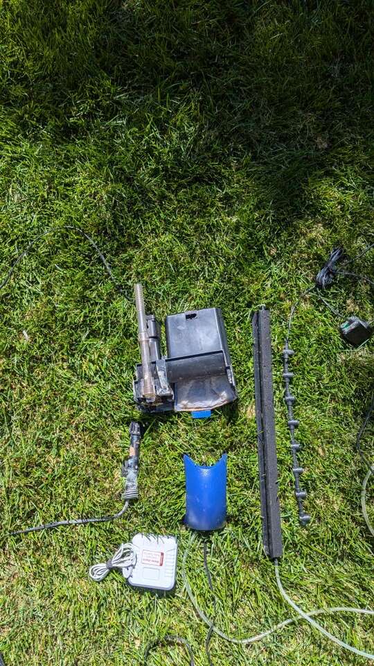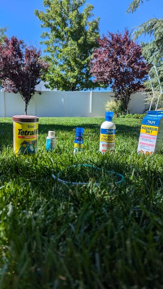 20 gallon fish inudes: Food Water chemicals(Salt, Super ick cure, Parasite remedy, Water conditioner) Air bubbles Water Filter Rocks Aquarium decor Automatic Feeder Water alarm Tray for tank Lights Lid Anything else in pictures