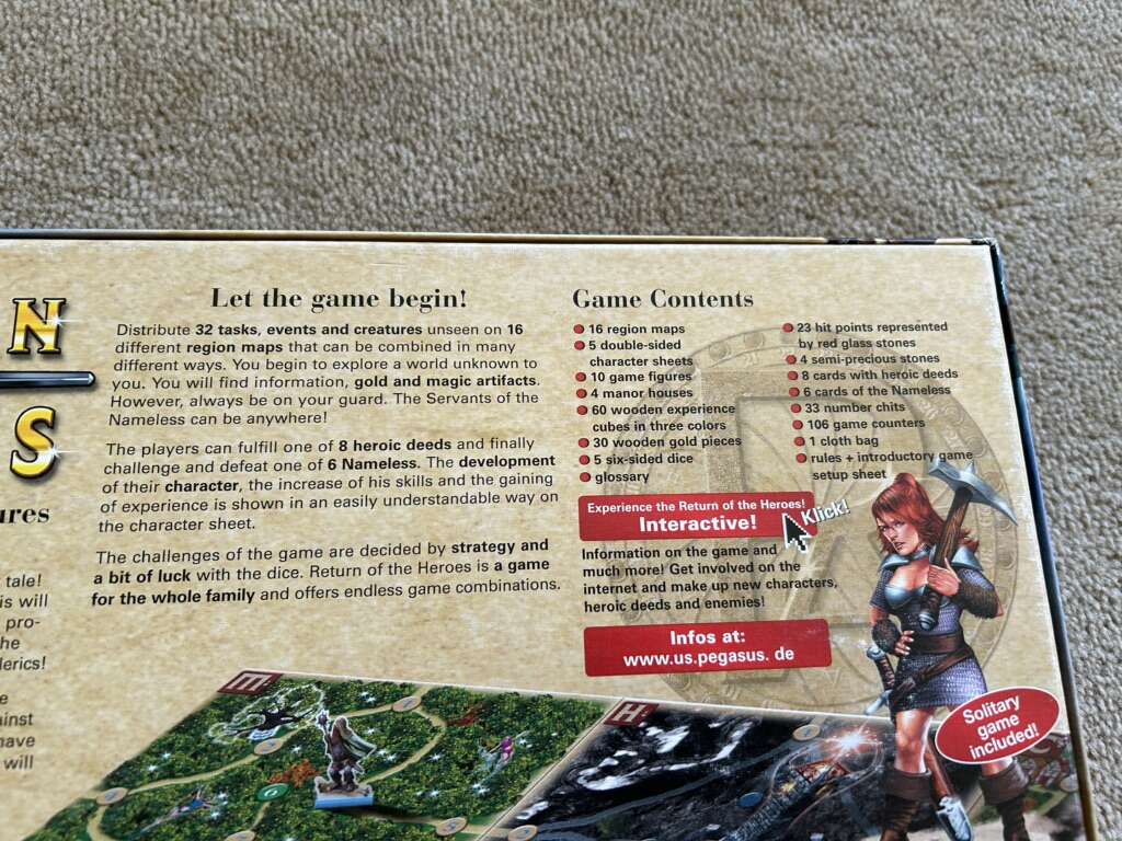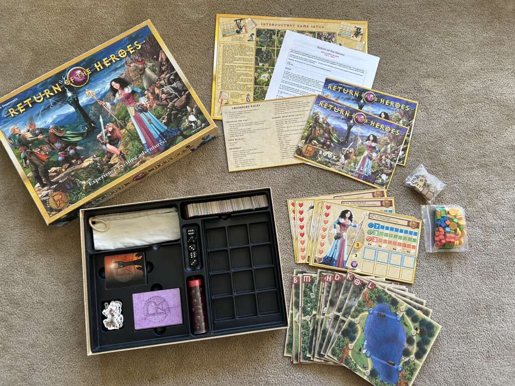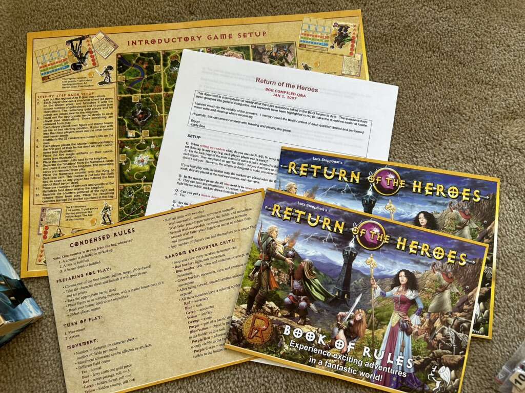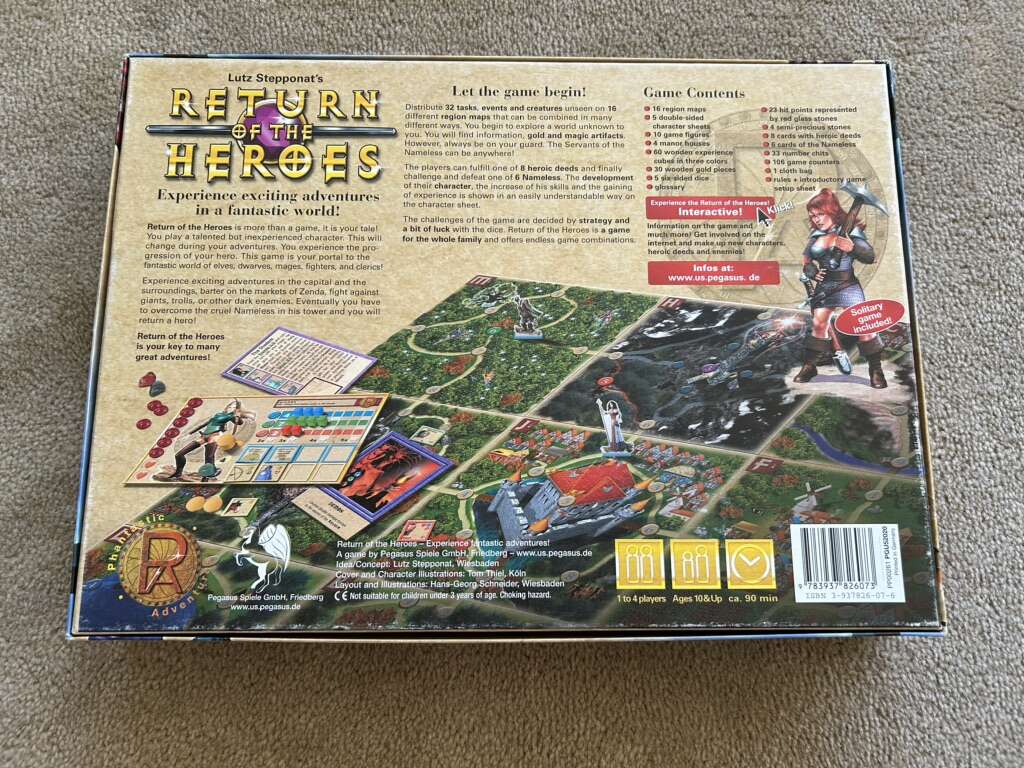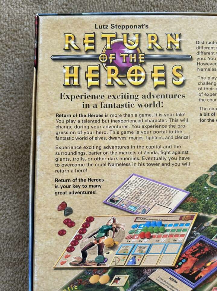 Return of the Heroes Board Game: Experience exciting adventures! By Lutz Stepponat, Pegasus Press, Phantastic Adventures, 2003. 1-4 players, age 10+. High-quality game, very good condition. Missing some plastic character stands. Text only. Cash or Venmo.