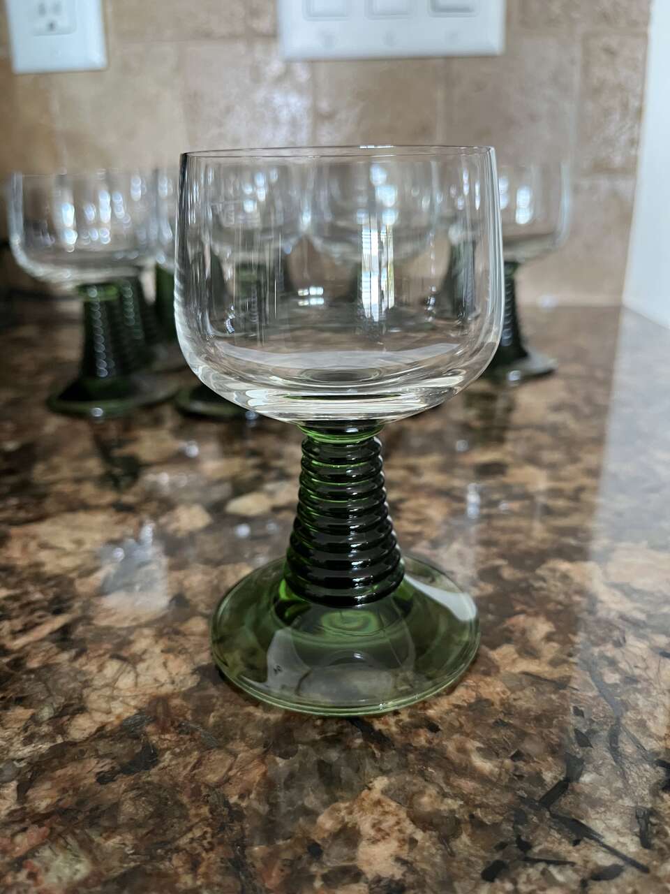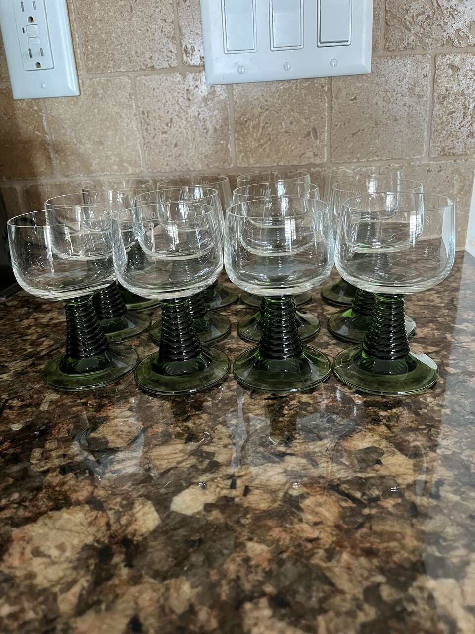 I am selling 12 Vintage wine glasses with green stem for $2.00 EACH. I got them as a wedding gift but never used them because I received several different wine glasses.
