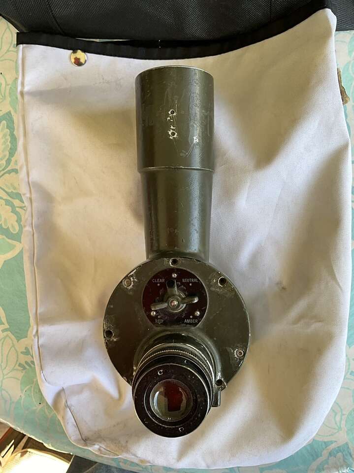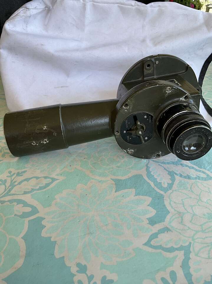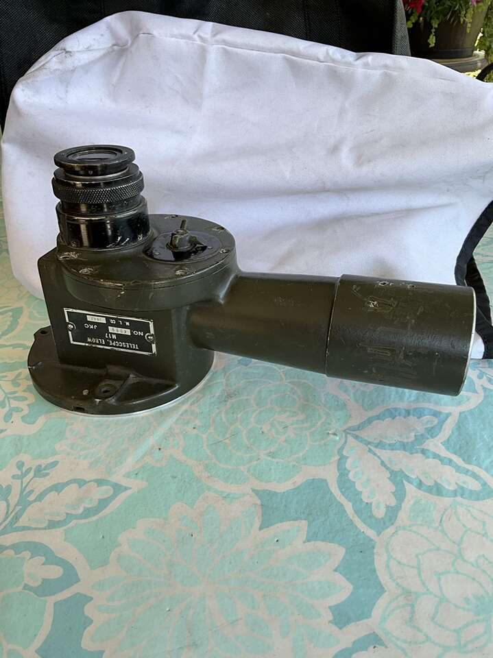 World War 2 military telescope elbow numbered M17. This can be used as a fixed distance and focus telescope. It has 4 different lens viewing filters: red, clear, neutral and amber. Great display piece. Originally mounted on some larger piece of equipment.