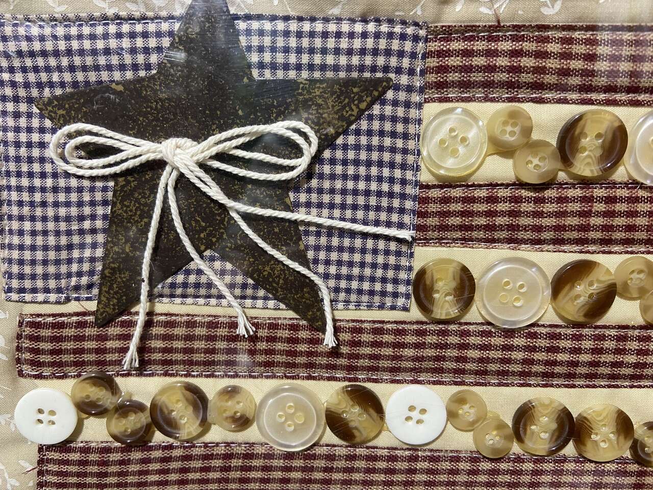 VenmoThis is a folk art repurposed vintage window frame with a cloth and button American Flag wall hanging. The piece measures 12.5" tall, 14.75" wide, and 1.75" deep.