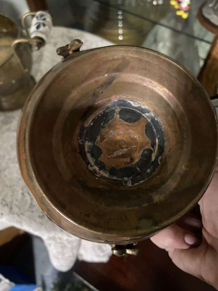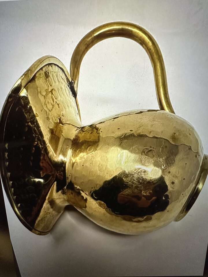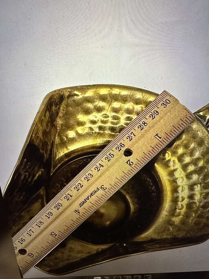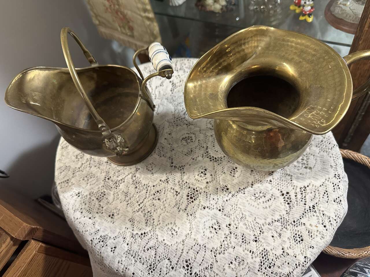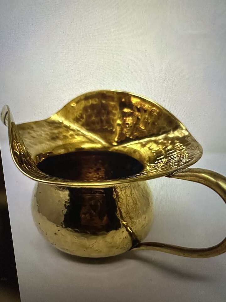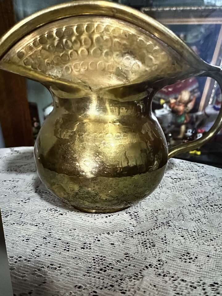 ****The Brass Pitcher..**.(right) Lovely solid brass pitcher with a hammered finish. Great antique brass decor or gift idea. An excellent base for a silk floral arrangement. Measures about 5 to 5 1/2 inches tall. about 9 " wide (see pics) In vintage condition with some patina and age spots.