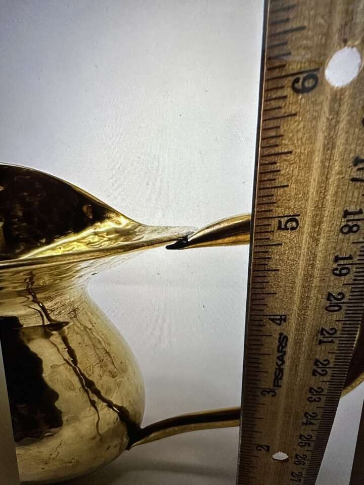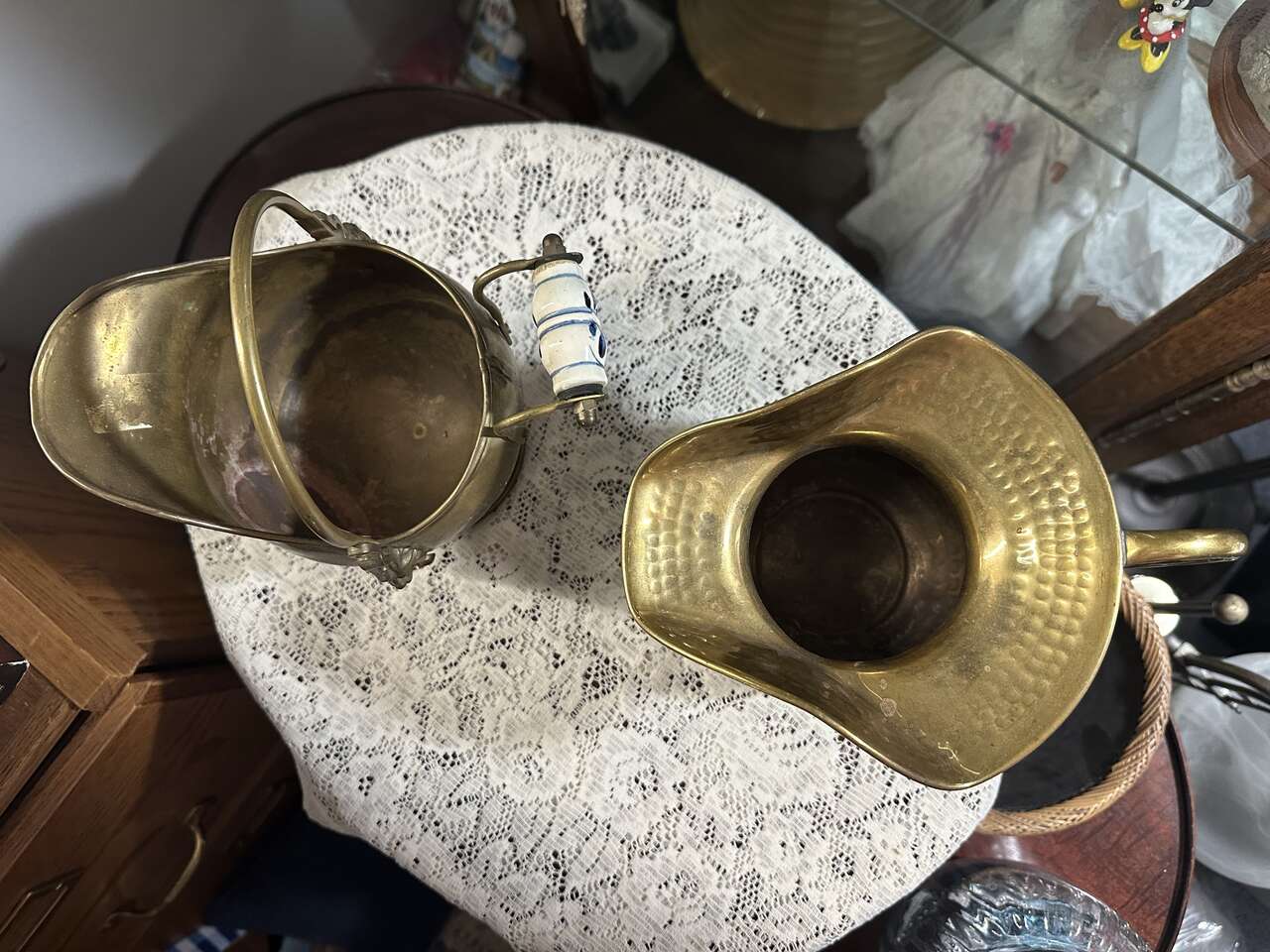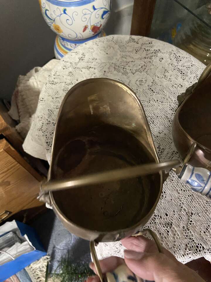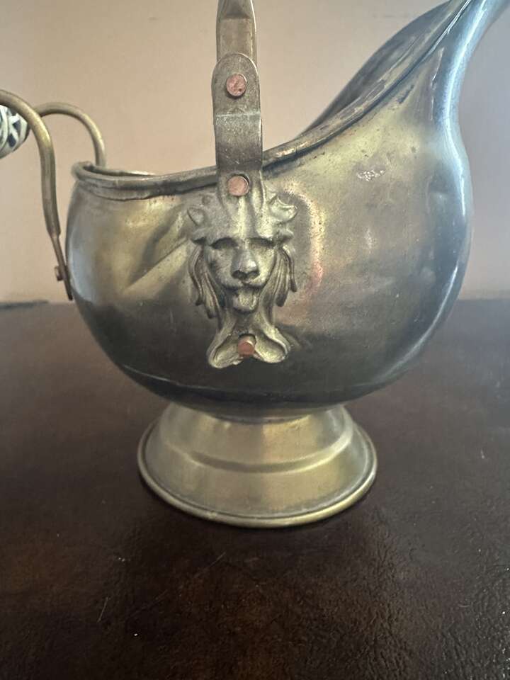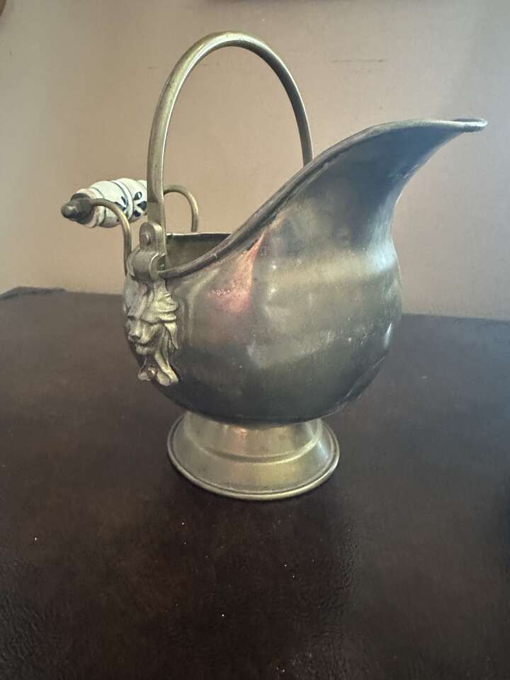 The Scuttle (left)...... 6.25" H at the Spout, 5.5" H at the porcelain handle, 7.25" long, handle to spout, 5.75" W at lions. Use as a decorative accent or a planter. Enjoy the nice aged patina or get some "Brasso' and shine it up to a mirror finish. Watch the attached video on to polish or not to polish. Vintage 1970's in the Colonial Style. The brass handle hinges forward or back