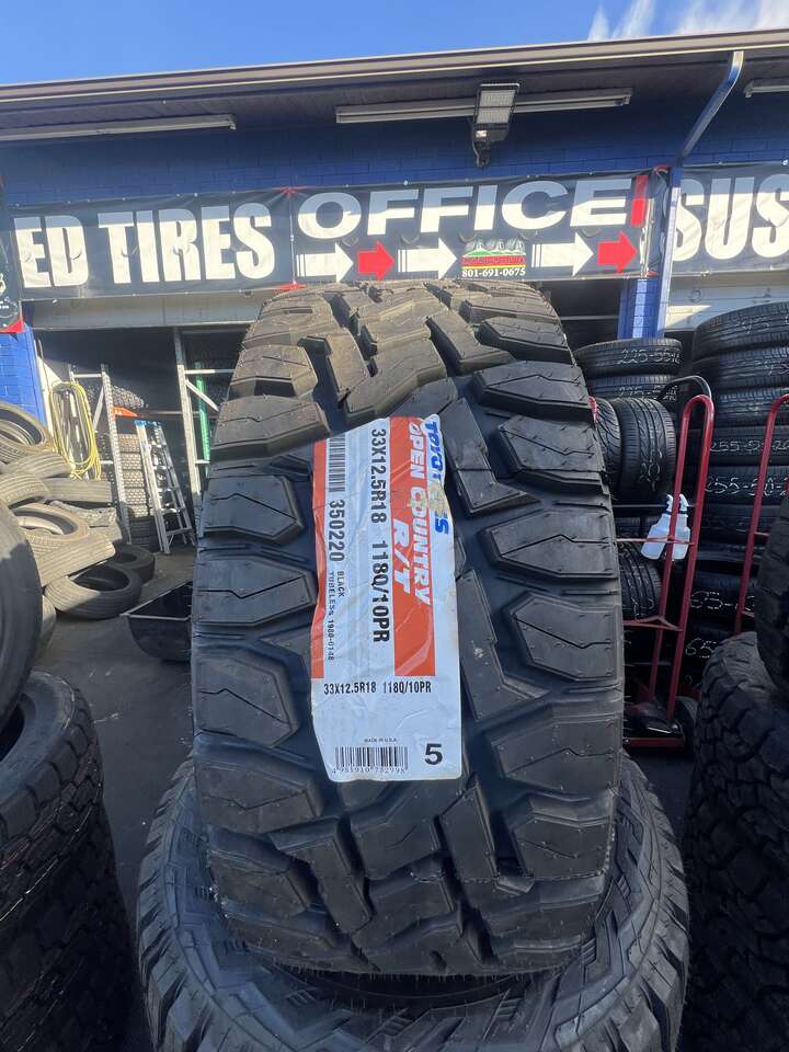 SET OF LT33X12.50R18 TOYO OPEN COUNTRY R/T LOAD RANGE E 10PLY ,WITH 45.000 MILES WARRANTY AWESOME DEAL . ASKING PRICE OF $1648.00 INCLUDES YOUR TAX, WE ALSO OFFER FREE INSTALLATION . HABLAMOS ESPANOL. WE CARRY OVER 200 SIZES AND CAN GET ANY MAJOR BRAND TIRES! WE ARE ALSO DOING, ALIGNMENTS, BRAKES AND SHOCKS. FINANCING OPTIONS AVAILABLE. NO CREDIT CHECK!. NOW OPEN CALIFORNIA TIRES 2.. CALIFORNIA TIRES & WHEELS 399 S STATE STREET OREM UT 84058 (801)691-0675