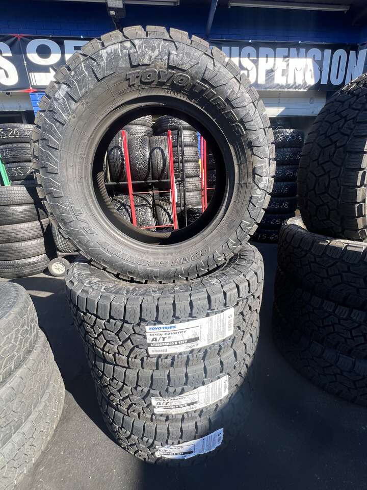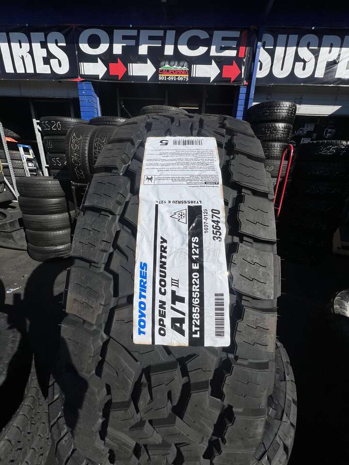 SET OF LT285/65R20 TOYO OPEN COUNTRY A/T LOAD RANGE E 10PLY ,WITH 55.000 MILES WARRANTY AWESOME DEAL . ASKING PRICE OF $1748.00 INCLUDES YOUR TAX, WE ALSO OFFER FREE INSTALLATION . HABLAMOS ESPANOL. WE CARRY OVER 200 SIZES AND CAN GET ANY MAJOR BRAND TIRES! WE ARE ALSO DOING, ALIGNMENTS, BRAKES AND SHOCKS. FINANCING OPTIONS AVAILABLE. NO CREDIT CHECK!. NOW OPEN CALIFORNIA TIRES 2.. CALIFORNIA TIRES & WHEELS 399 S STATE STREET OREM UT 84058 (801)691-0675
