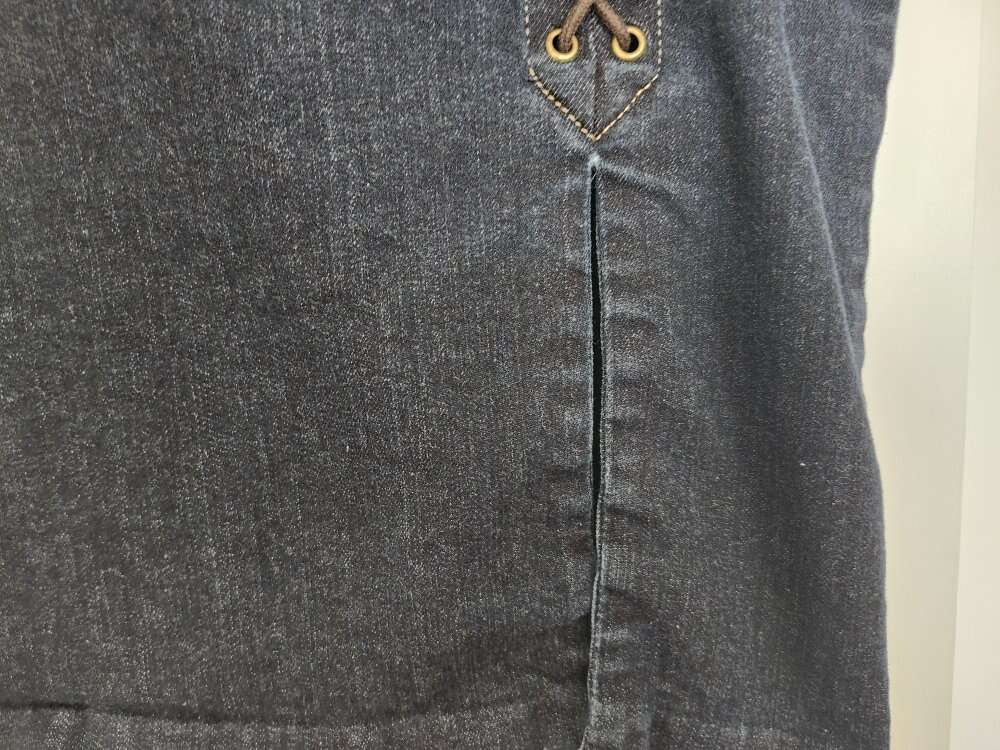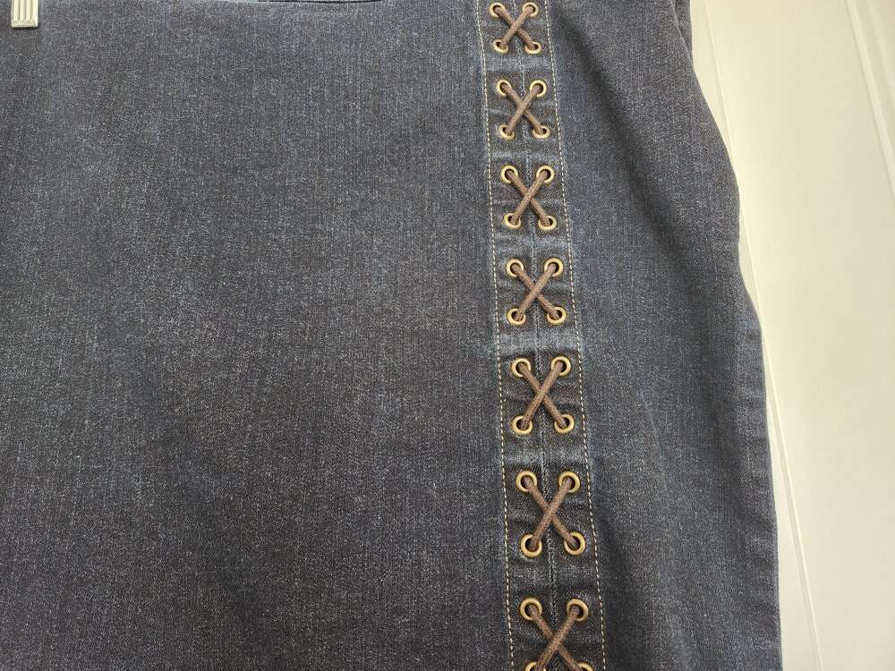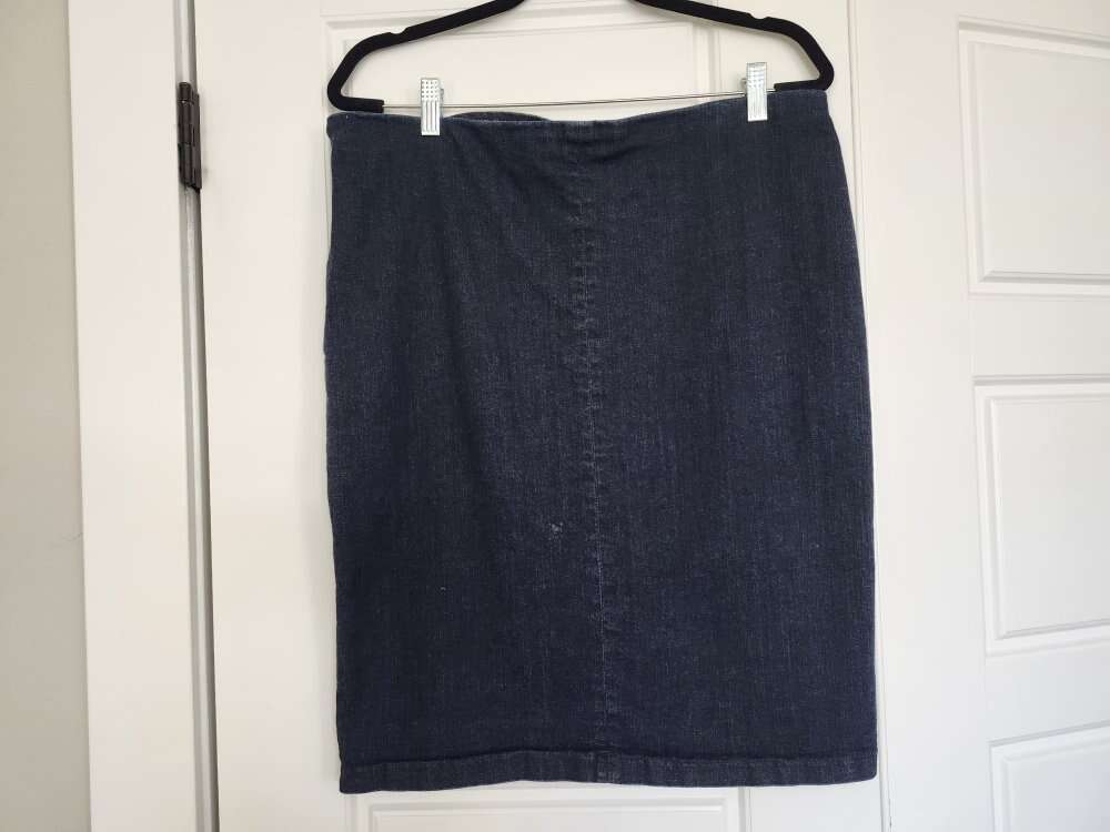 This Ralph Lauren dark denim pencil skirt is a size 14 and has good stretch. It has dark brown stitching down the side and a small slit.