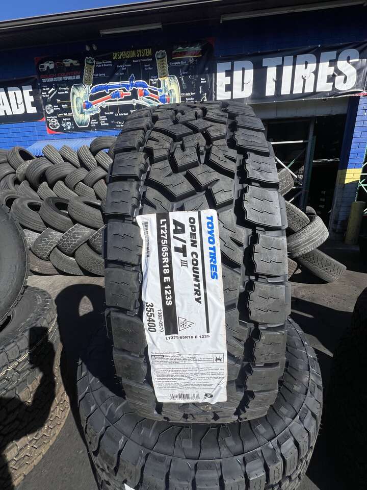 SET OF LT275/65R18 TOYO OPEN COUNTRY A/T LOAD RANGE E 10PLY ,WITH 55.000 MILES WARRANTY AWESOME DEAL . ASKING PRICE OF $1398.00 INCLUDES YOUR TAX, WE ALSO OFFER FREE INSTALLATION . HABLAMOS ESPANOL. WE CARRY OVER 200 SIZES AND CAN GET ANY MAJOR BRAND TIRES! WE ARE ALSO DOING, ALIGNMENTS, BRAKES AND SHOCKS. FINANCING OPTIONS AVAILABLE. NO CREDIT CHECK!. NOW OPEN CALIFORNIA TIRES 2.. CALIFORNIA TIRES & WHEELS 399 S STATE STREET OREM UT 84058 (801)691-0675