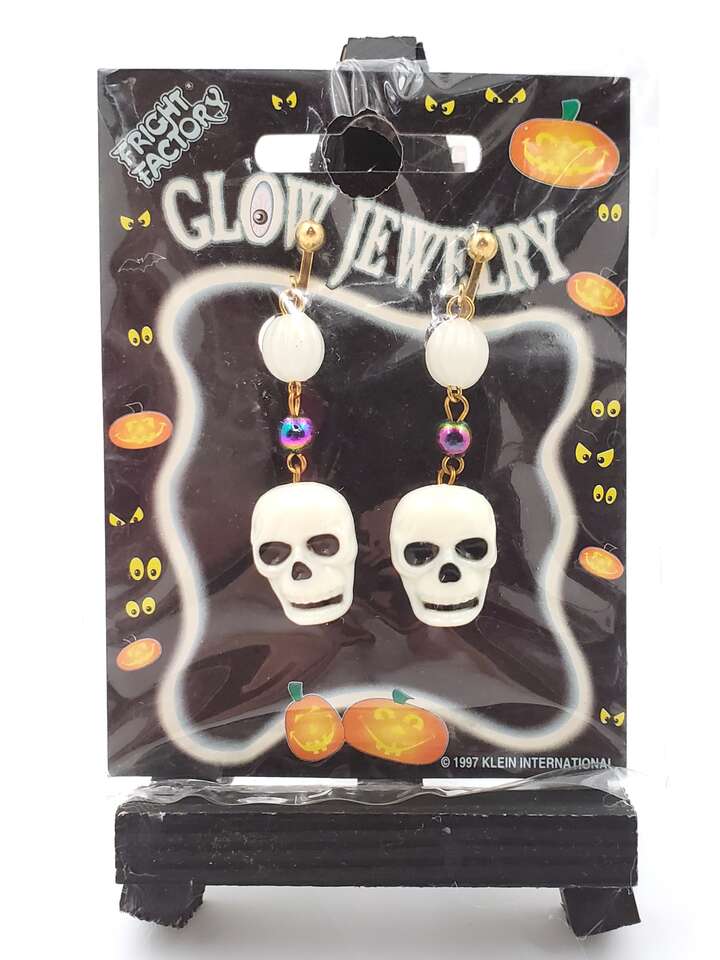 RARE vintage (1997) glow-in-the-dark Halloween dangle earrings from “Fright Factory”. Simply expose earrings to sunlight or strong lamplight and watch them glow!