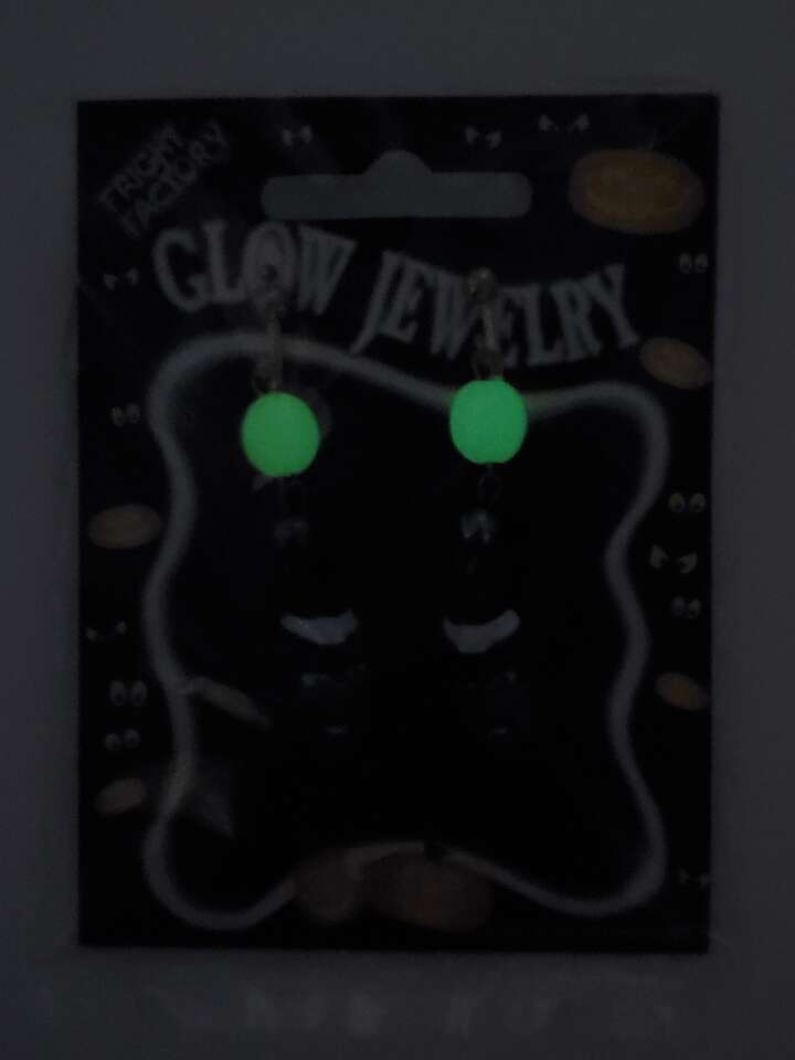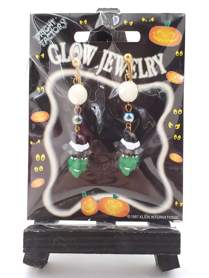 RARE vintage (1997) glow-in-the-dark Halloween dangle earrings from “Fright Factory”. Simply expose earrings to sunlight or strong lamplight and watch them glow!