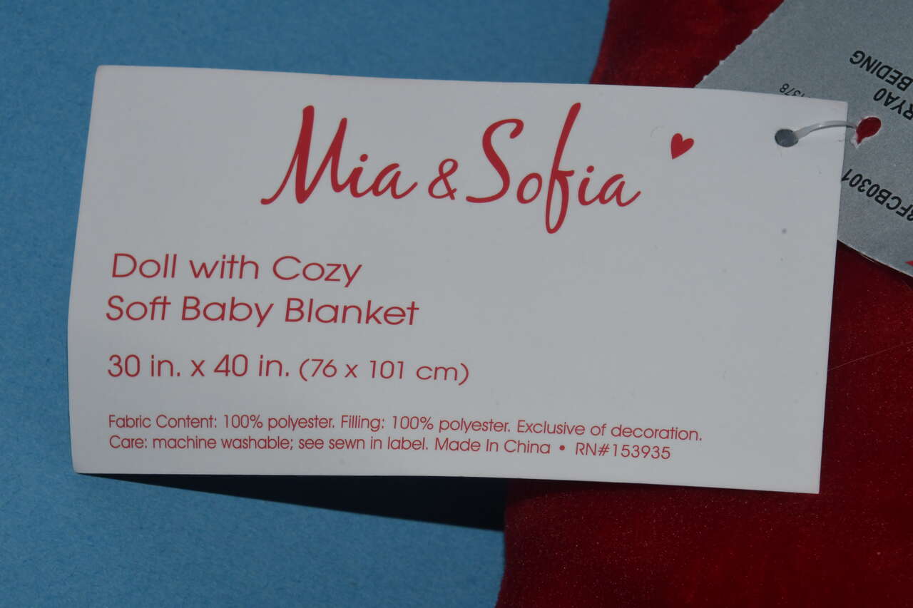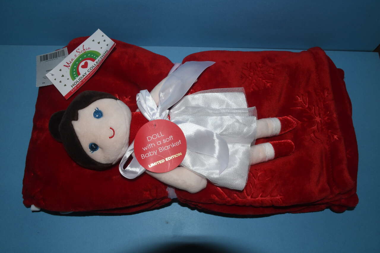 This NEW MIA & SOFIA SOFT DOLL with a RED BABY BLANKET (30" x 40") is from a smoke free home. The blanket has a snowflake pattern. The doll is about 13" in height. Questions??? Please ask. We are located in Plain City. cash only please.