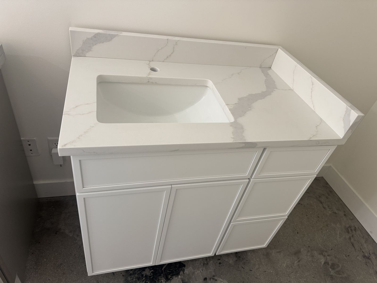 ApplePay36” plywood bathroom vanity with soft-close doors & drawers. Multiple colors available. Quartz, granite, quartzite, marble, porcelain countertop options available.