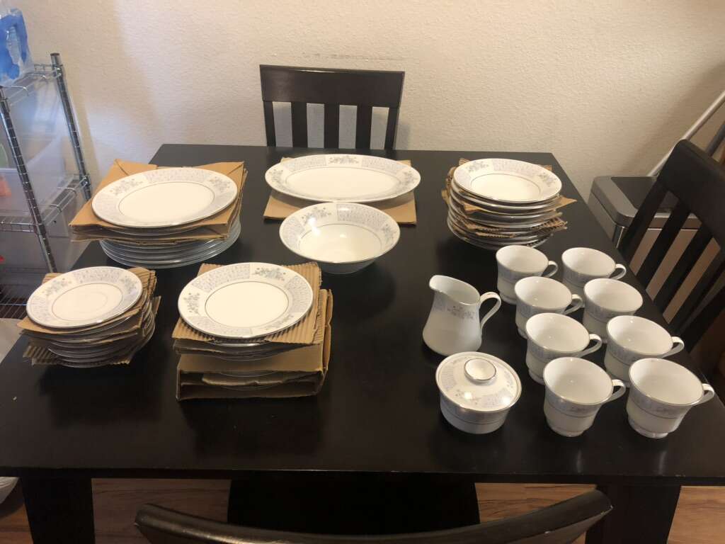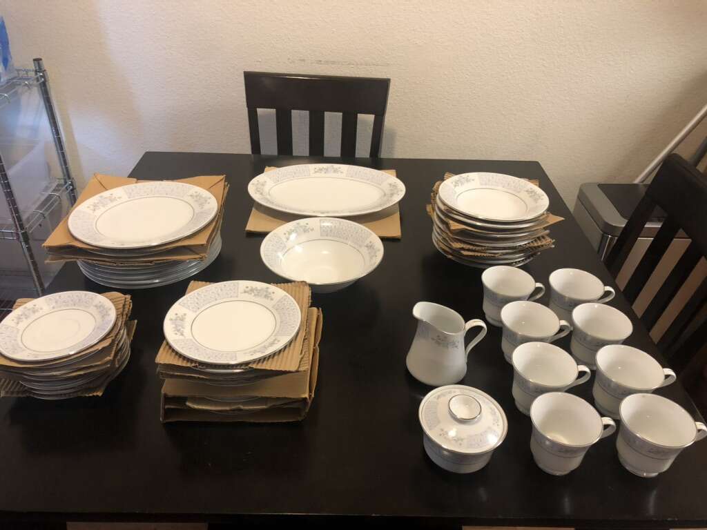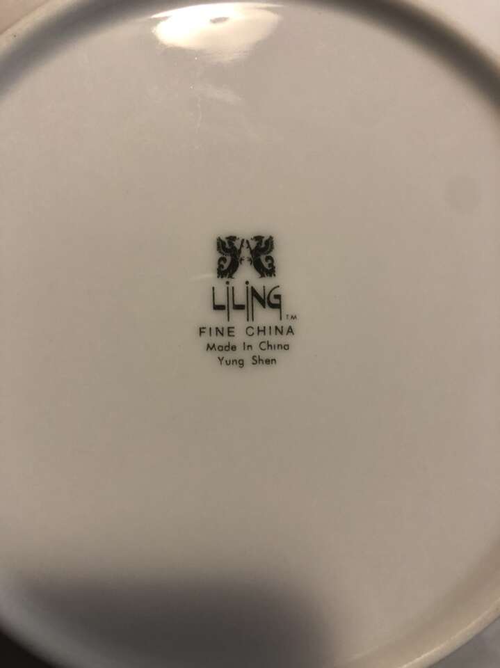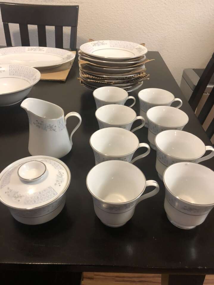 LILING Fine China Yung Shen set of 50 pieces. Chateau blue/grey floral design with a platinum trim.
