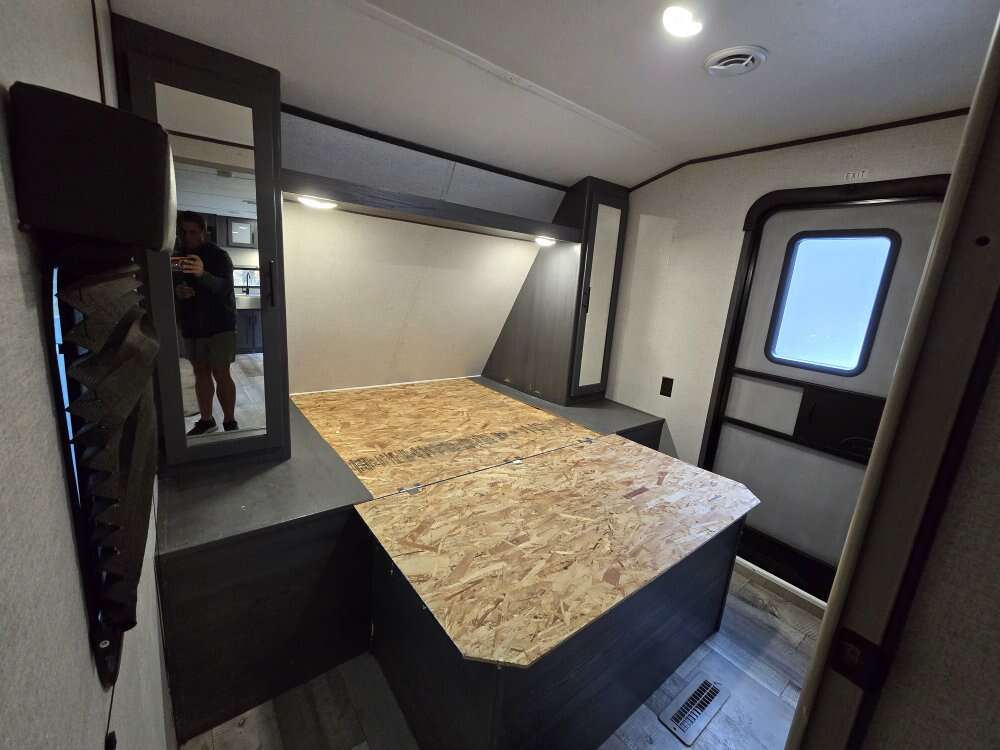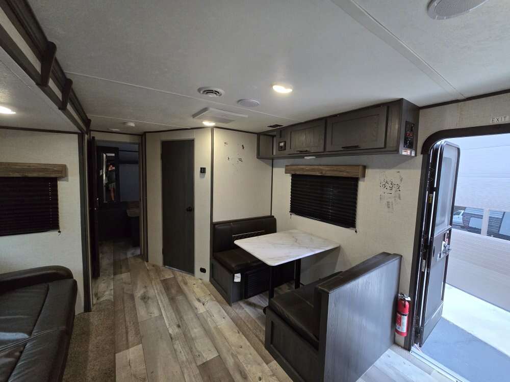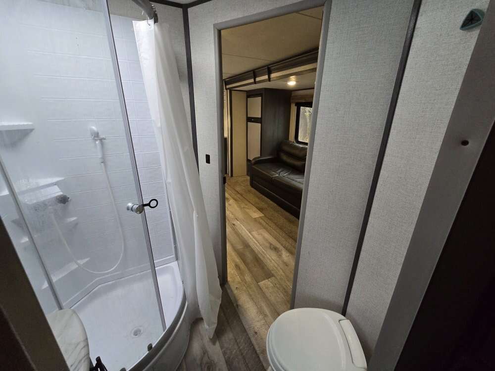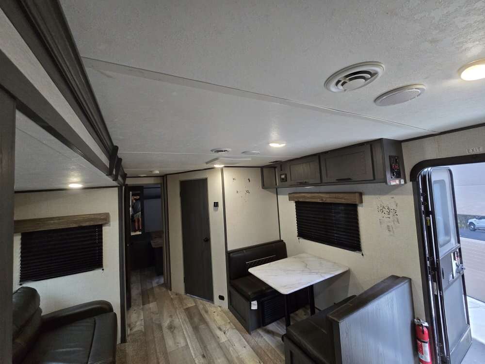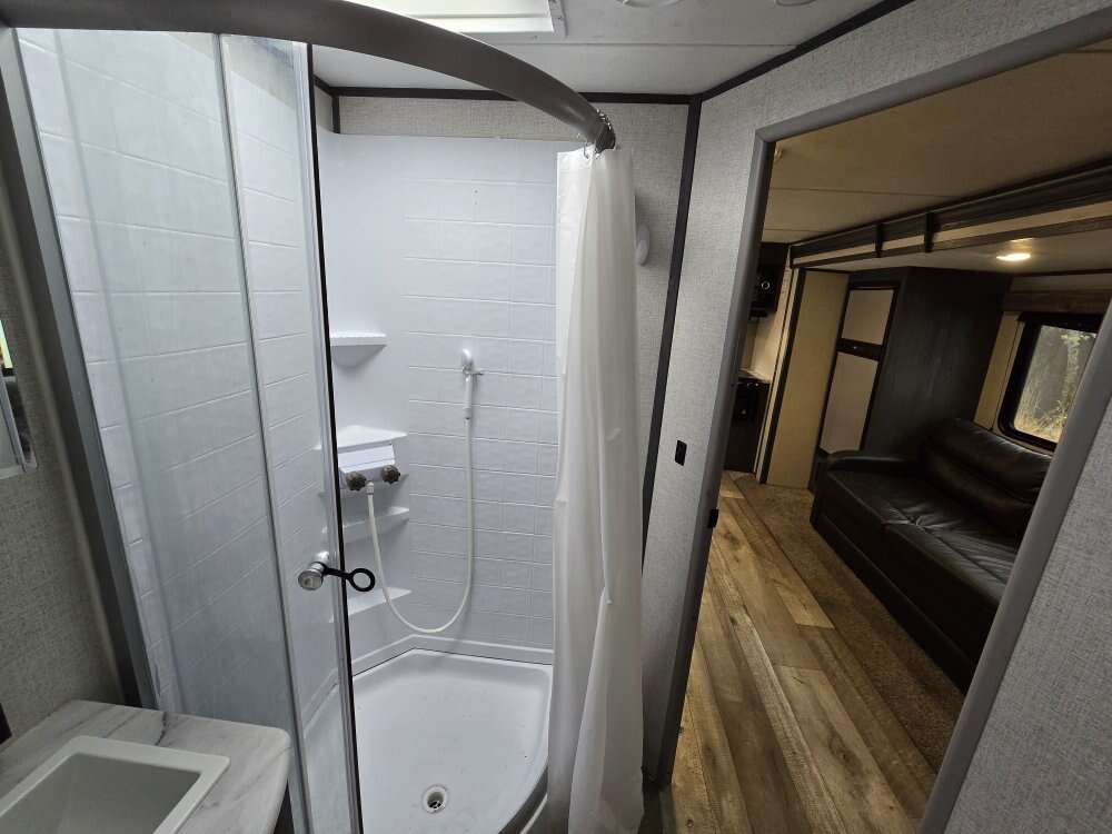 Great trailer in good shape, has two entry doors. Pass through storage with a slide out. Has a rare rear kitchen that gives you a tone of space. Has a queen size bed up front and a fold out full and a dinett that coverts into a bed.
