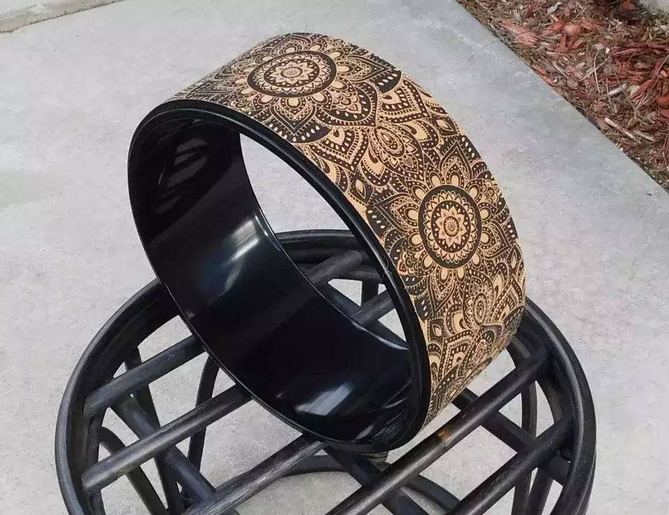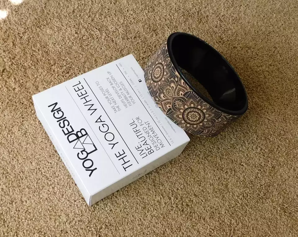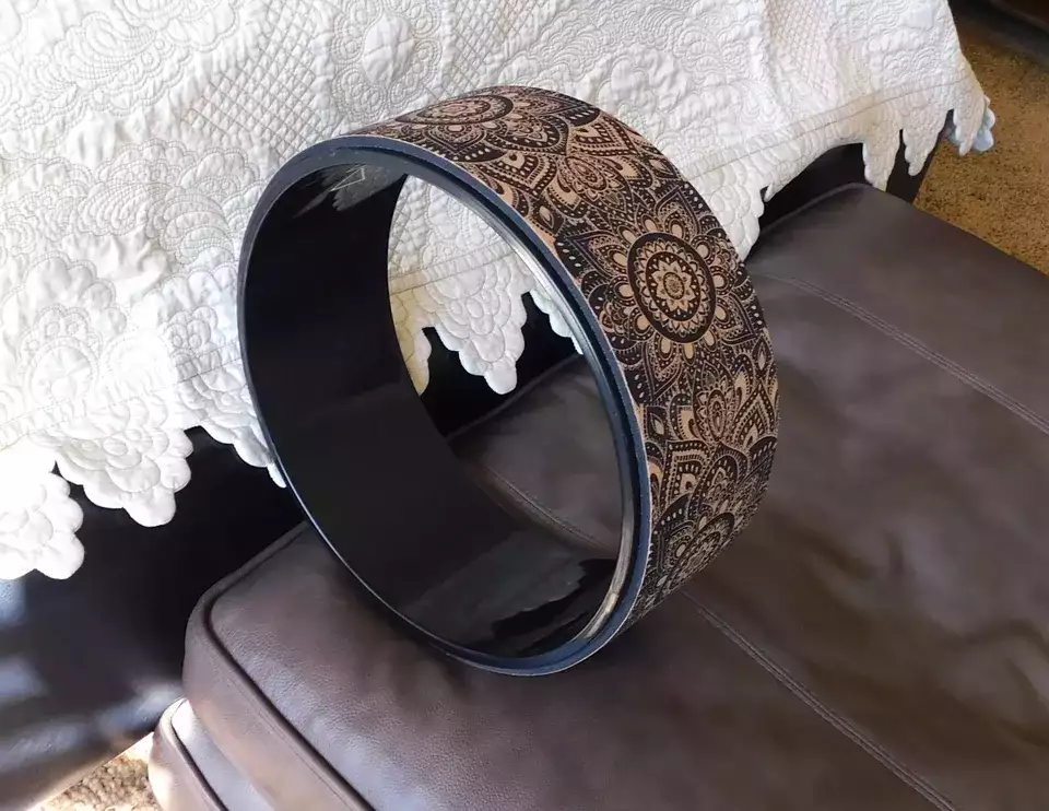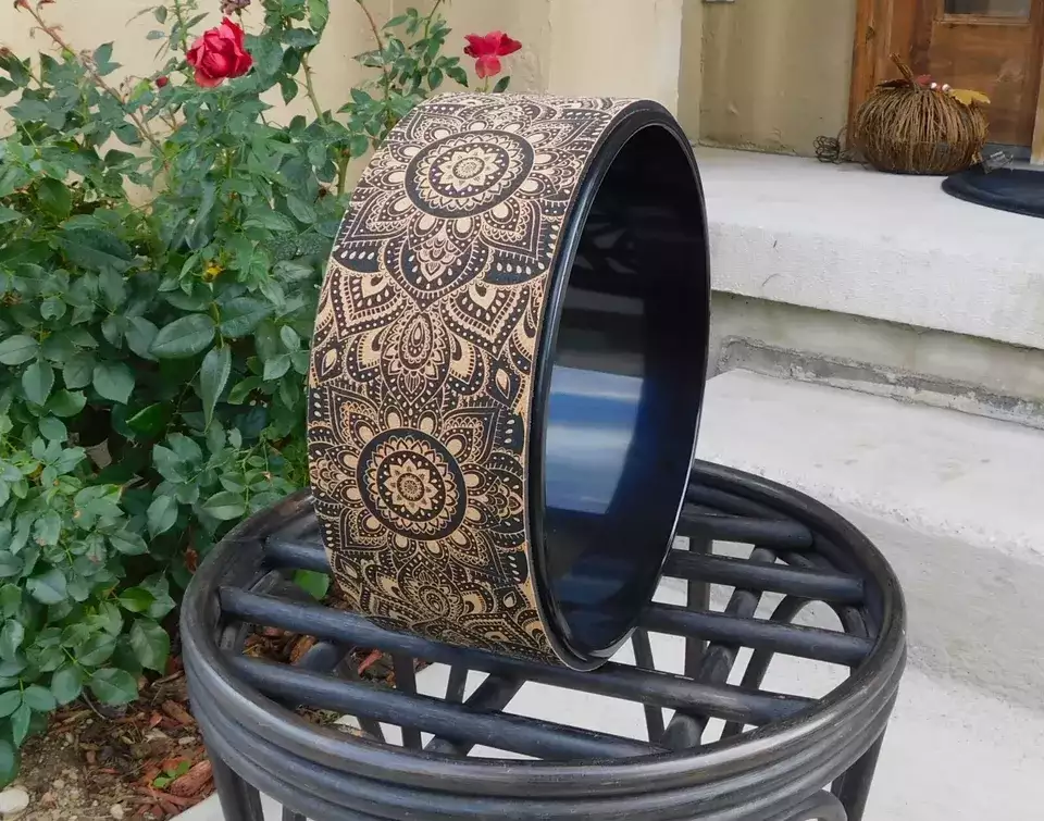 Yoga wheel by Yoga Design Lab offers support for challenging poses, helps to loosen tight muscles and flexibility (helps to open the chest, shoulders, back and hip flexors). Black color with natural cork pad (black mandala print), easy to clean. Materials- natural cork which is naturally anti-bacterial, non toxic water based ink, TPE, ABS, 13 1/8" diameter, 5" wide. New with box, originally $68 selling for $45.