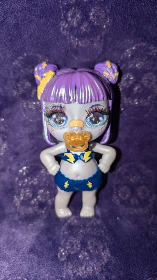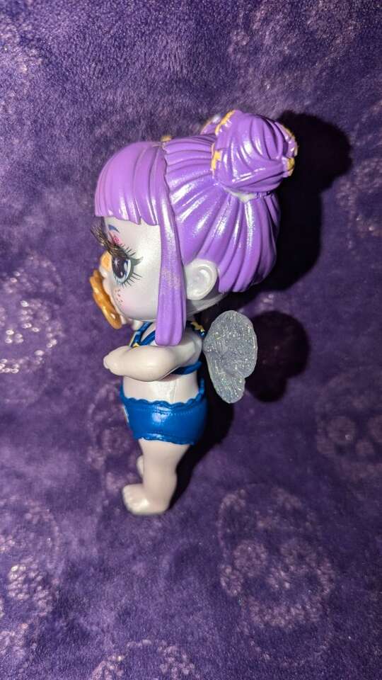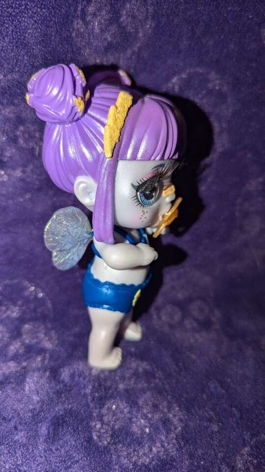 I just love the iridescent paint, bandaid on her nose, big eyes, and lighting bolt pigtails!