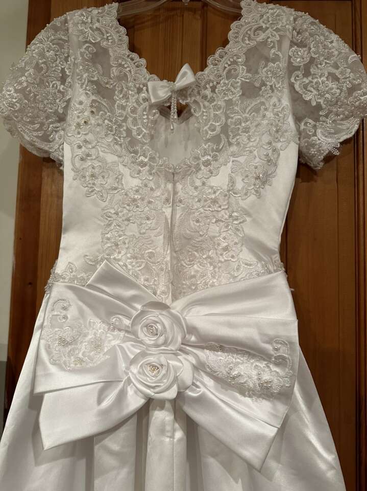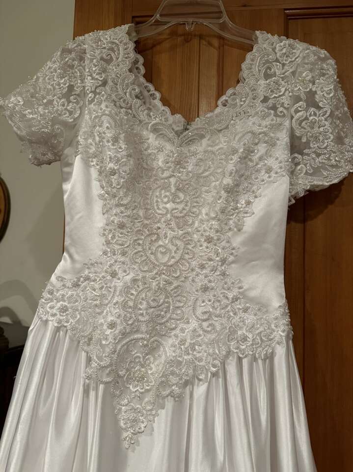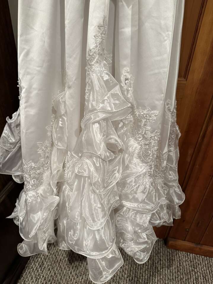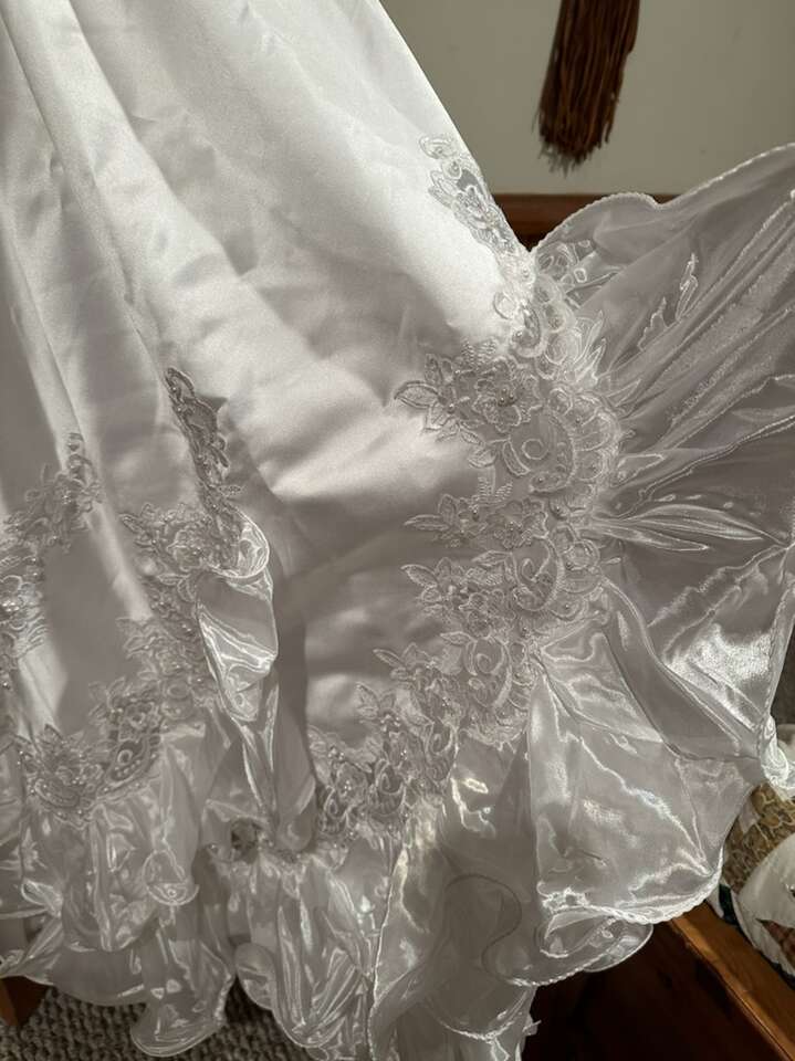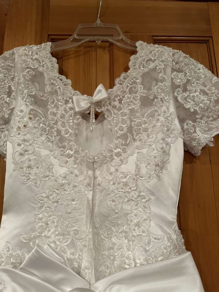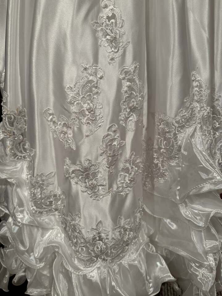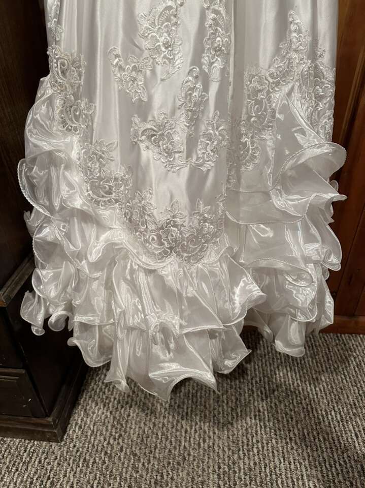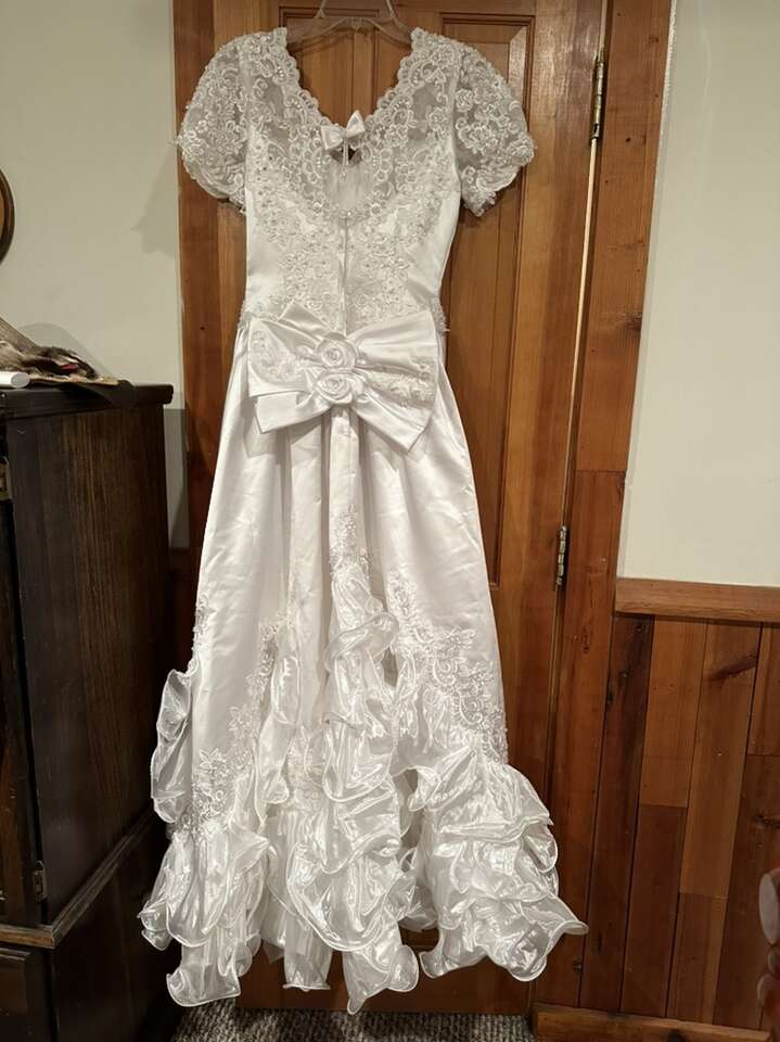 Wedding dress that had a lot of good times. It had a couple spots so needs to be dry cleaned. A lot of ruffles, bows, lace and pearls. Made from a satin fabric. No size tag but I think it is about a size 6. Come try it on and see how pretty it fits. Call me Janna