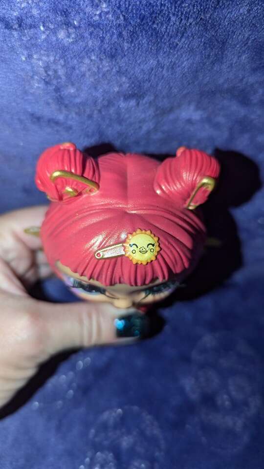 I just love the iridescent paint, the safety pins in her hair, and the big eyes.