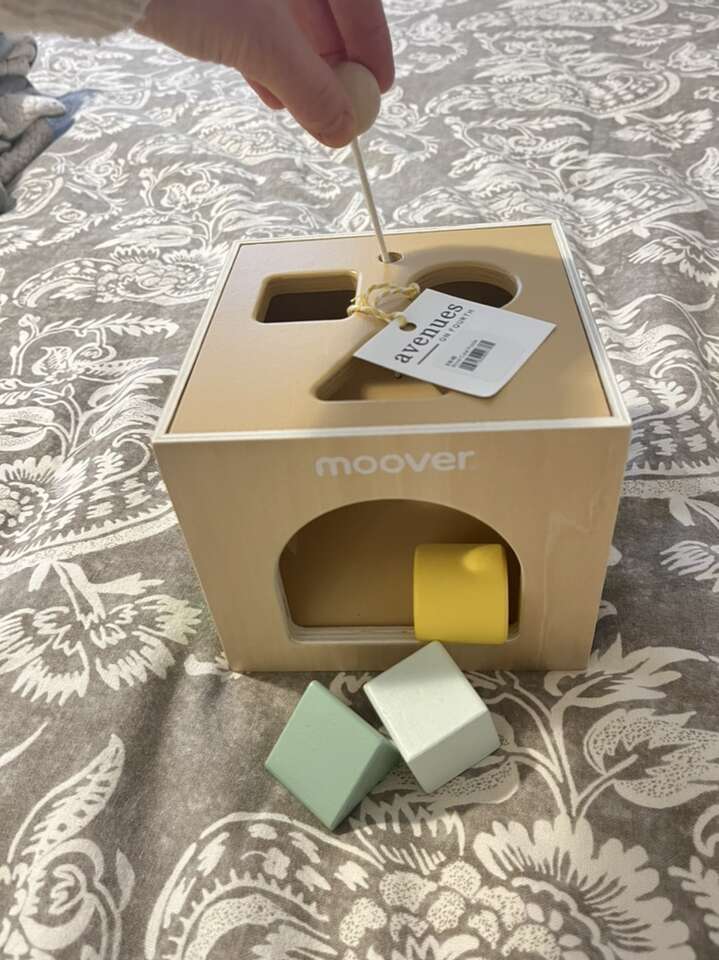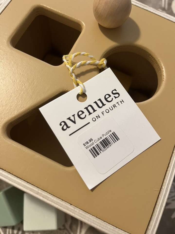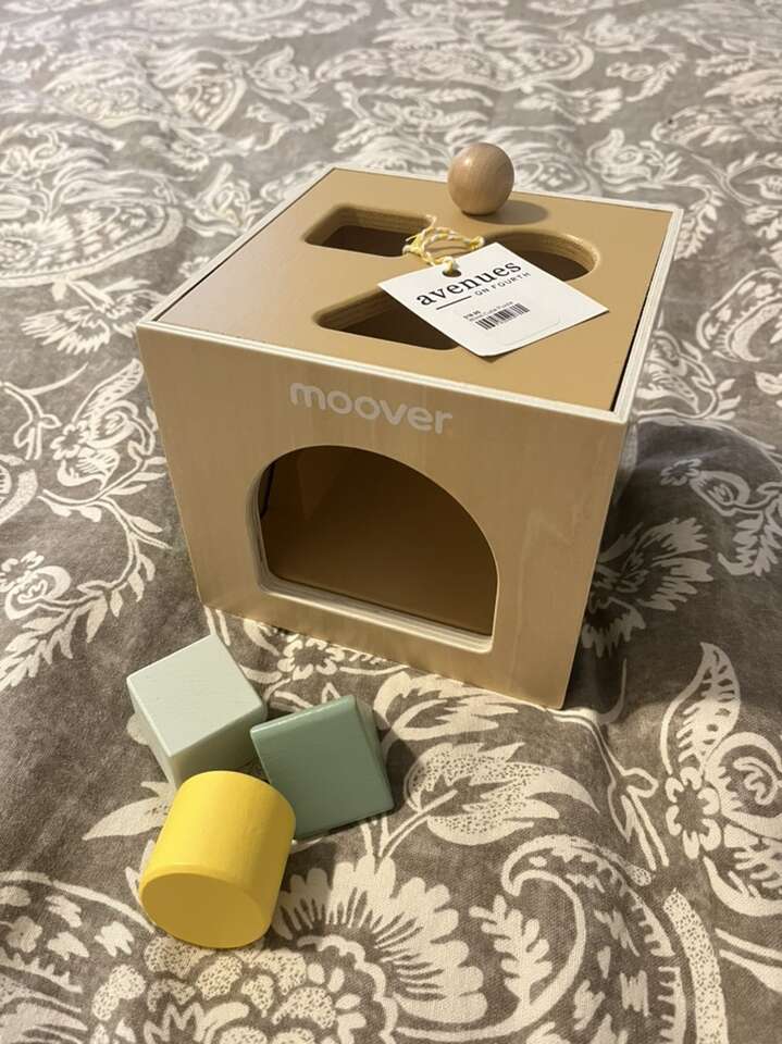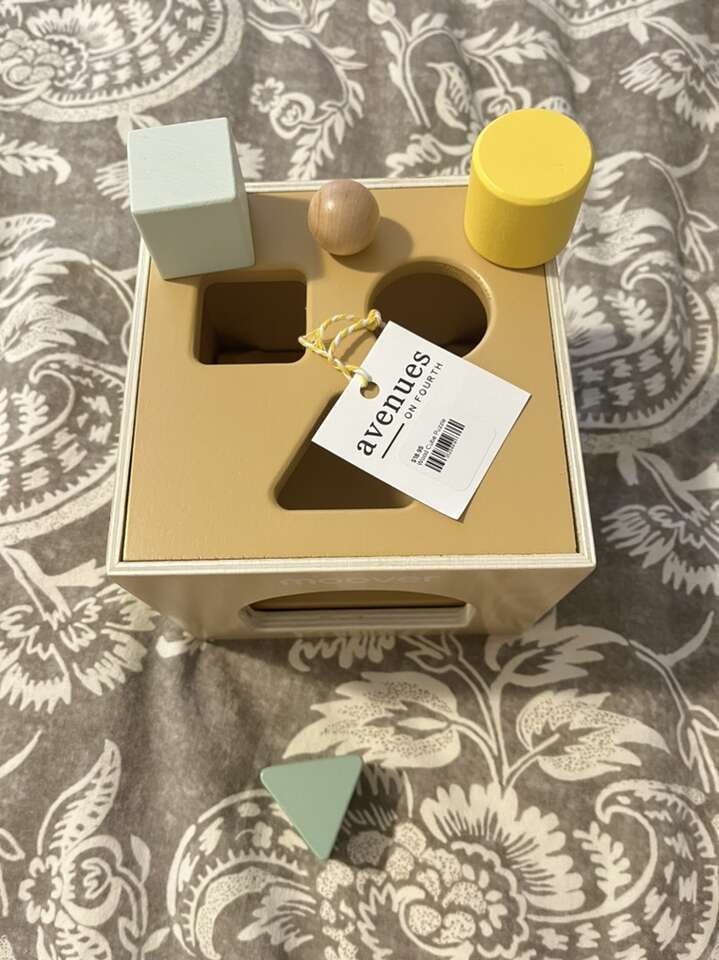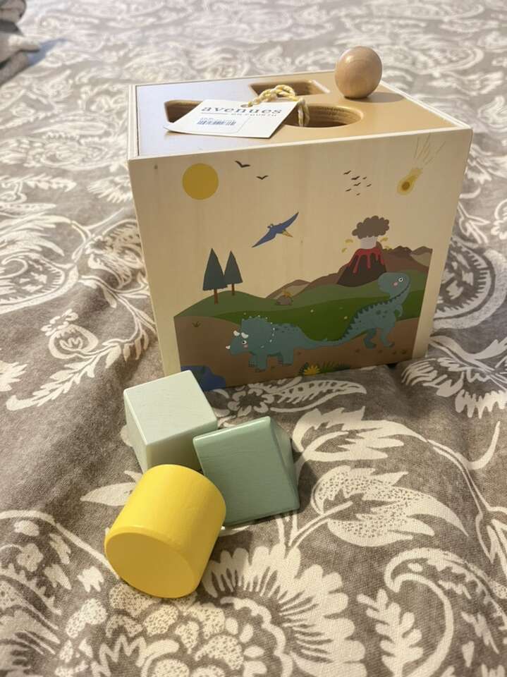 Brand new with tags. Wooden baby shape sorter toy. Dinosaur theme. Comes with three blocks. The cube has a pull string mechanism that automatically slides the blocks back out. So fun for baby! Ready to go for your little one, baby shower or gift.
