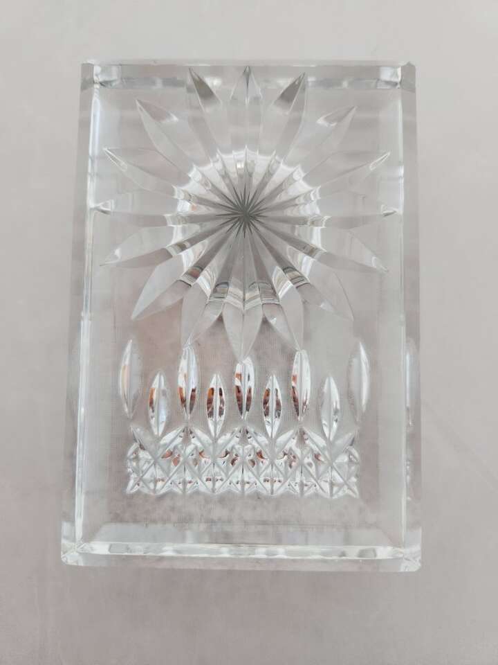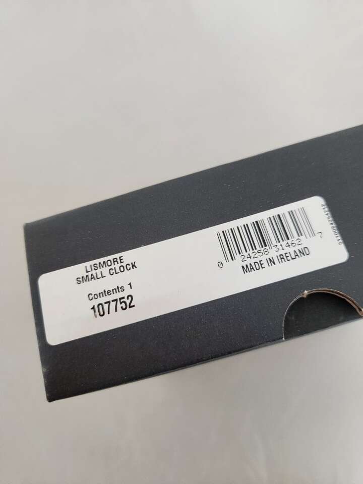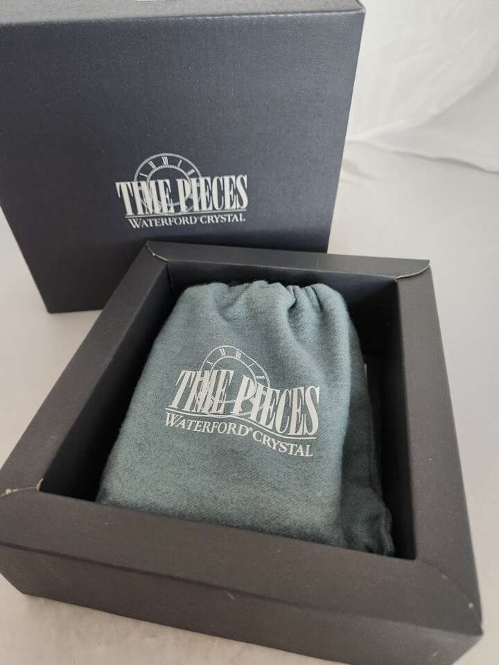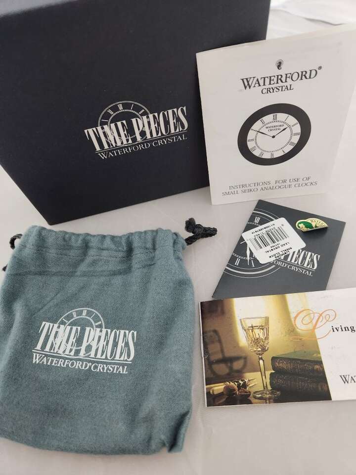 Authentic Waterford crystal small clock. 4.25" tall, 3.5" wise. Clock face with Roman numerals. Requires size 377 watch battery. Like new and in original box with documentation.