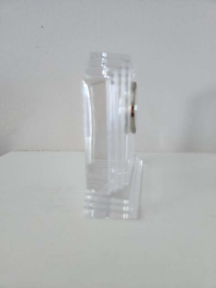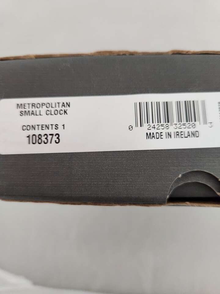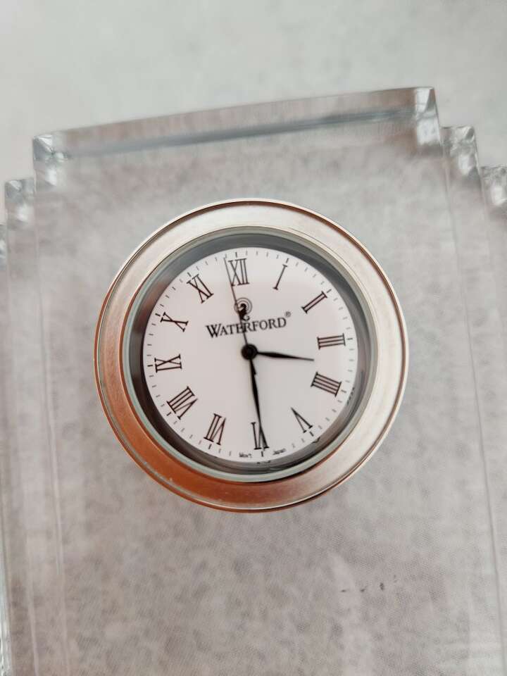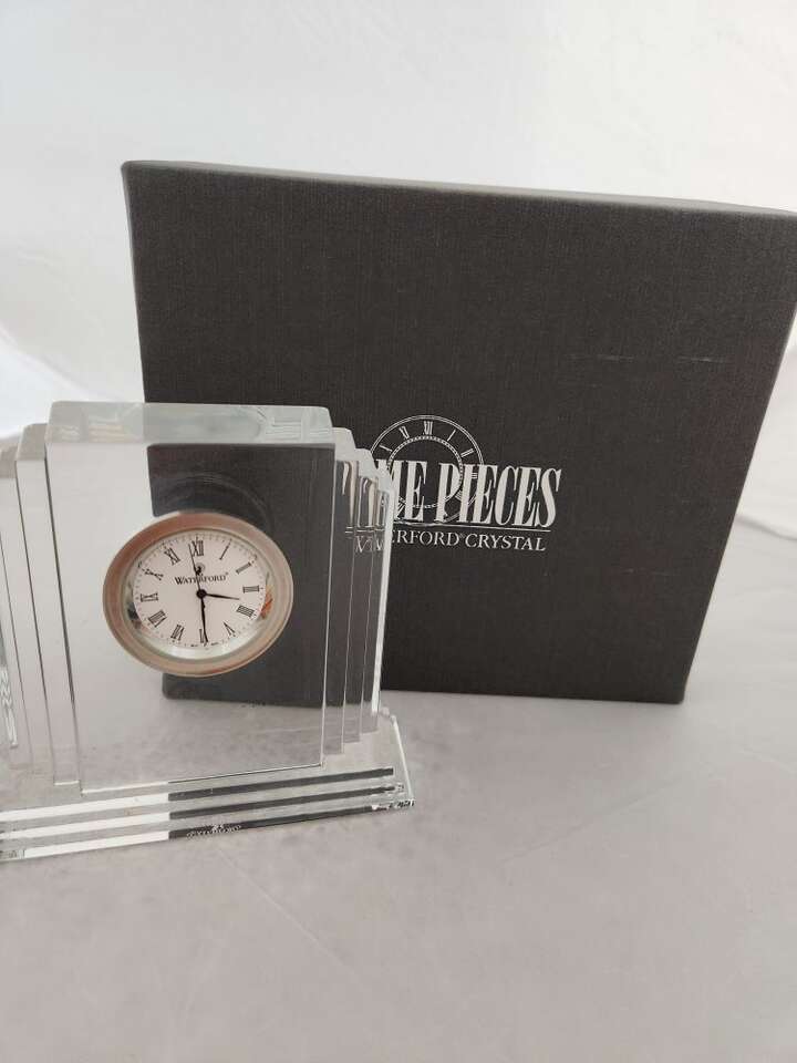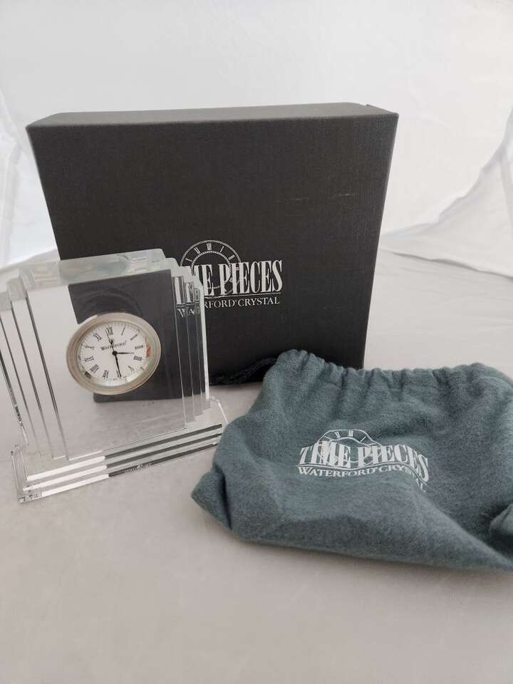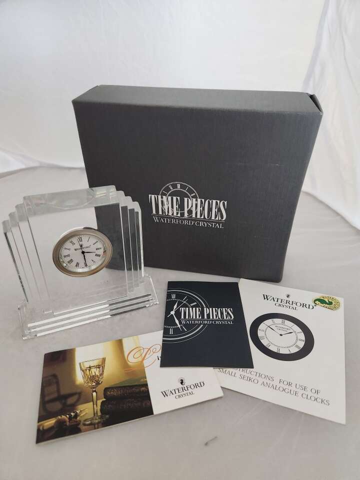 Small Waterford crystal Metropolitan clock. Includes original box and certification. Like new. Requires size 377 watch battery.