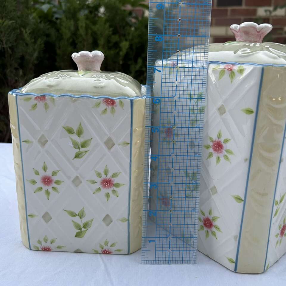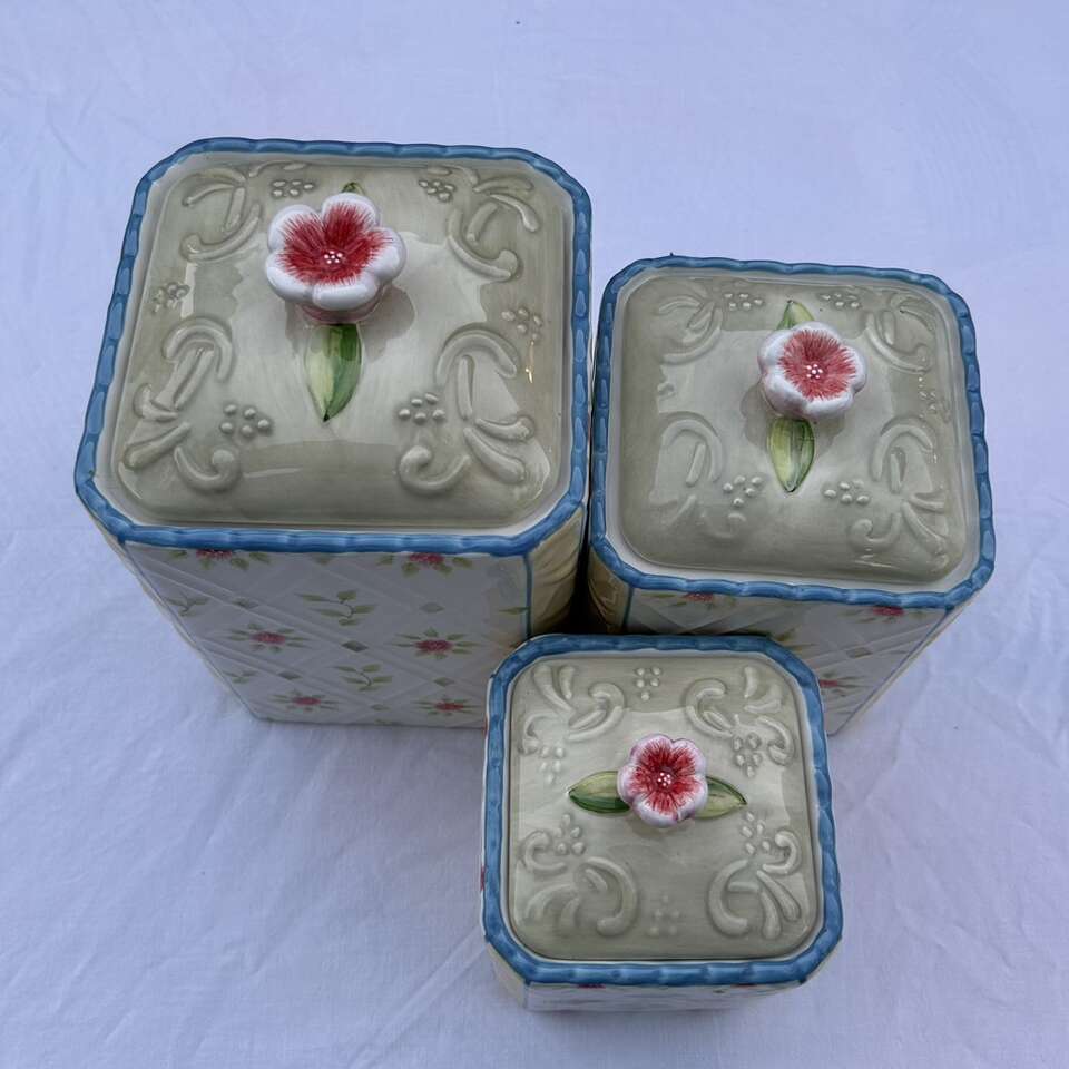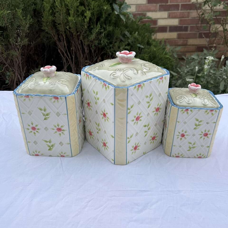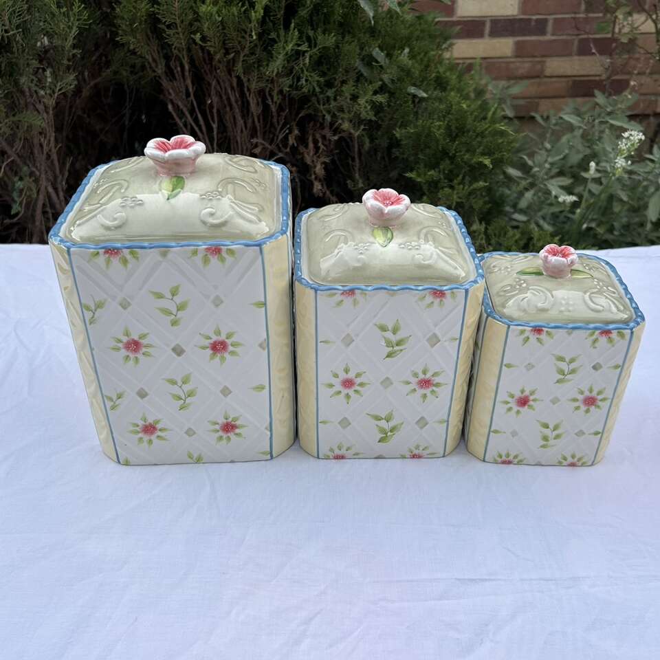 3 RARE matching Country Inn” Canisters. The color scheme is sophisticated beginning with a double lattice on an ivory background on each side with flowers & green leaves alternating in the diamond shapes. This is bordered by pale yellow on the corners and edged with sky blue. These lovely vintage canisters look more like a quilt than kitchen storage and could actually be used in a sewing room or in a bathroom. Versatile style lends itself to French Provincial, Cottagecore, Grandmacore, Grannycore, Maximalist, Pastel, and Shabby Chic interior decor styles. Made by Home Interiors for Better Homes and Gardens.